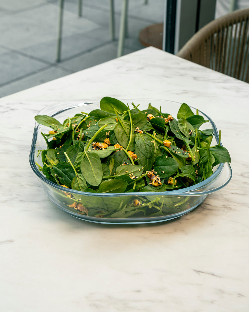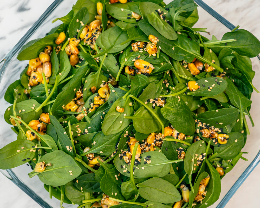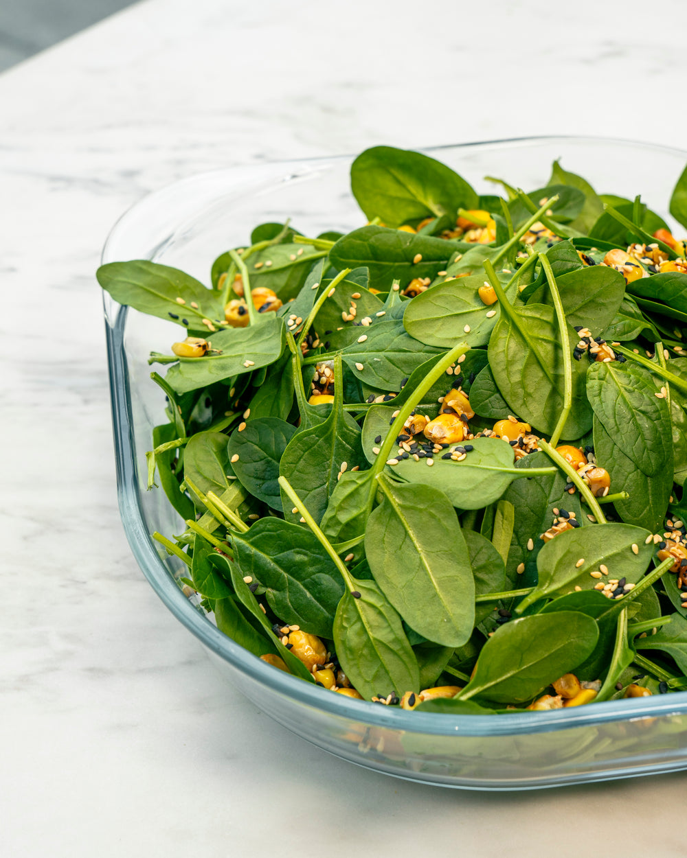 Baby spinach with grilled fresh corn and kancha crispy corn, sesame tahini dressing