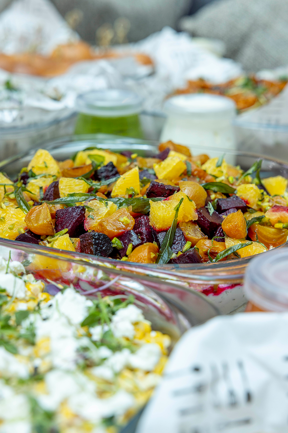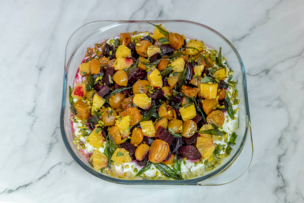 Red and gold baby beetroot caramelized with honey served on whipped dill mascarpone. Seasoned with pistachio pesto, parsley oil, fresh zaatar, pistachio powder and orange segments. Served with crispy bread