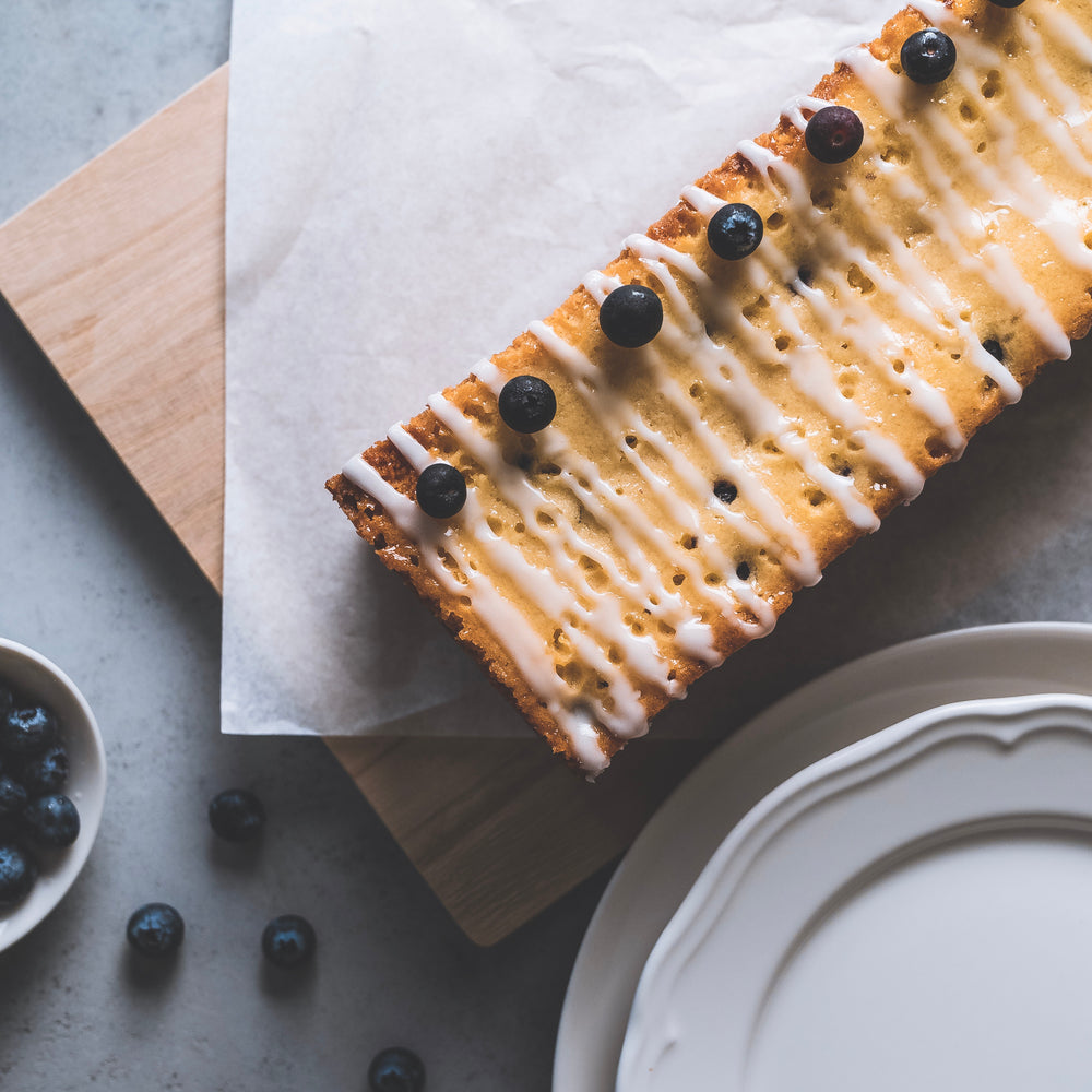 Moist lemon sponge with blueberries, topped with a glaze and decorated with more berries