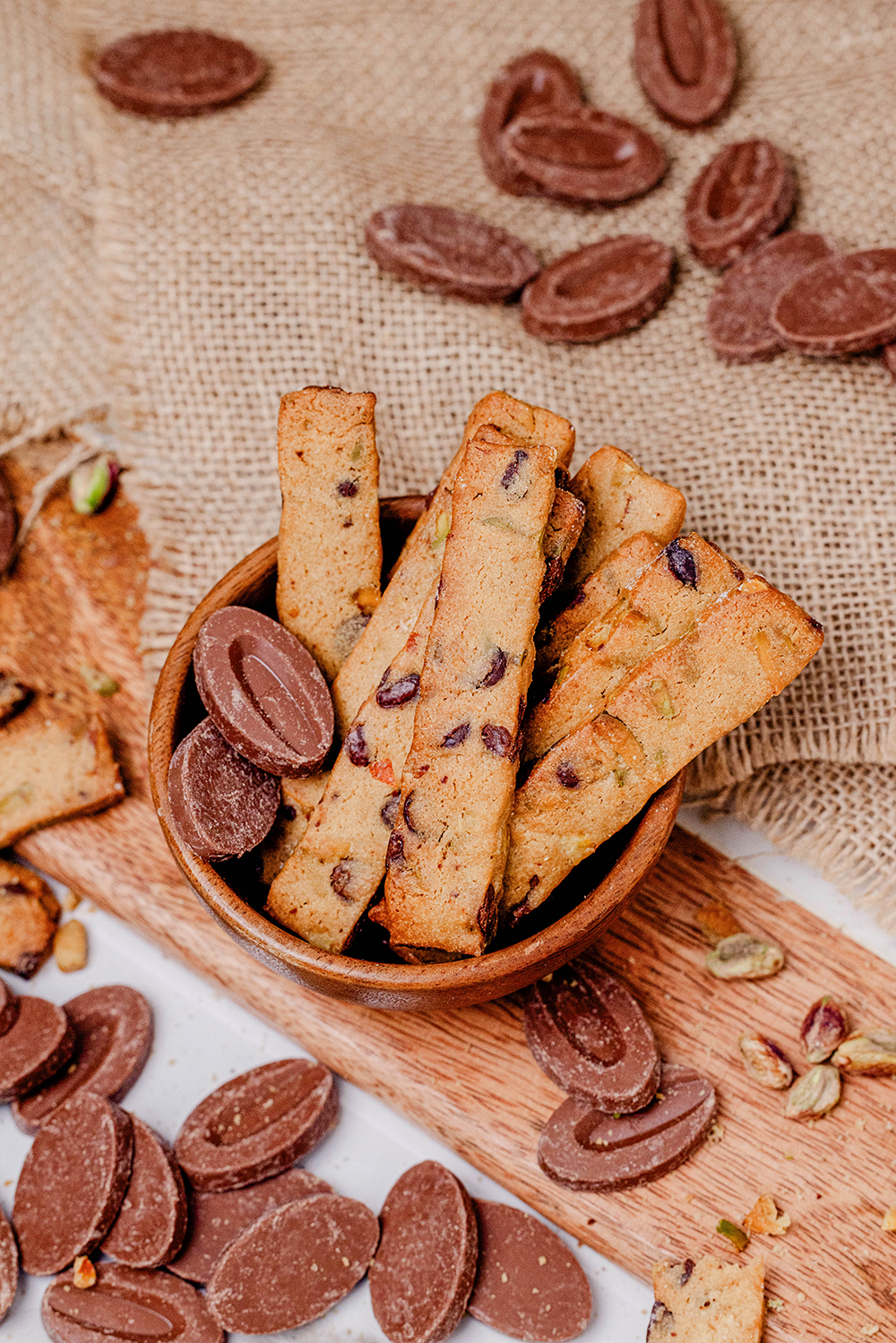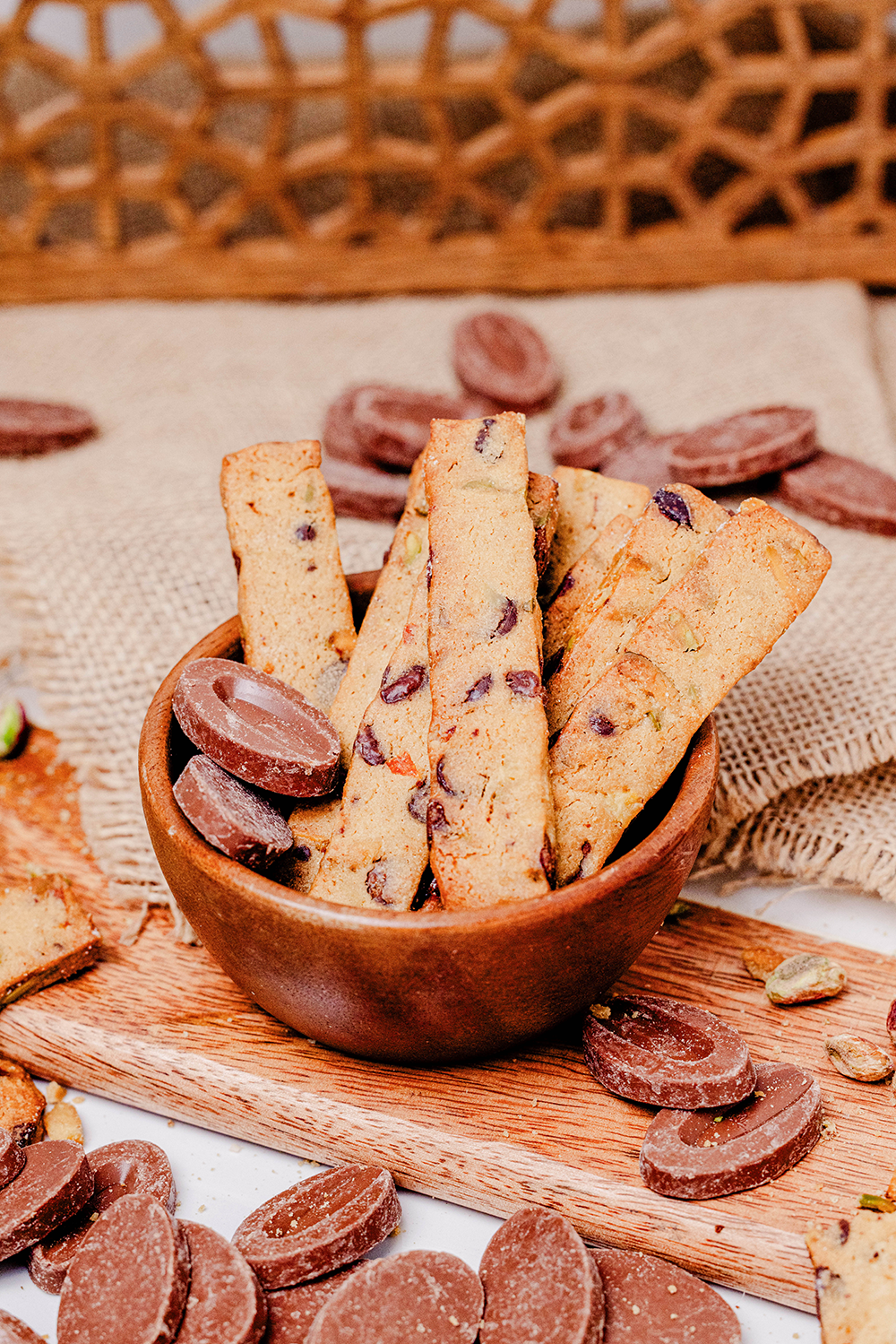 Biscuit with dark chocolate chips, candied orange and pistachio.(20 PCs)
