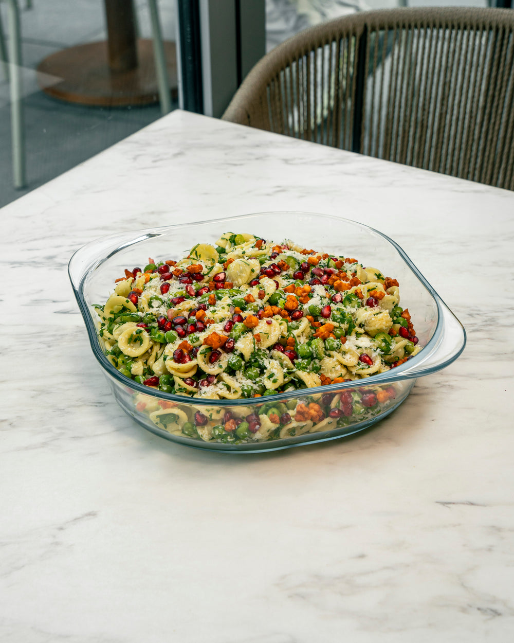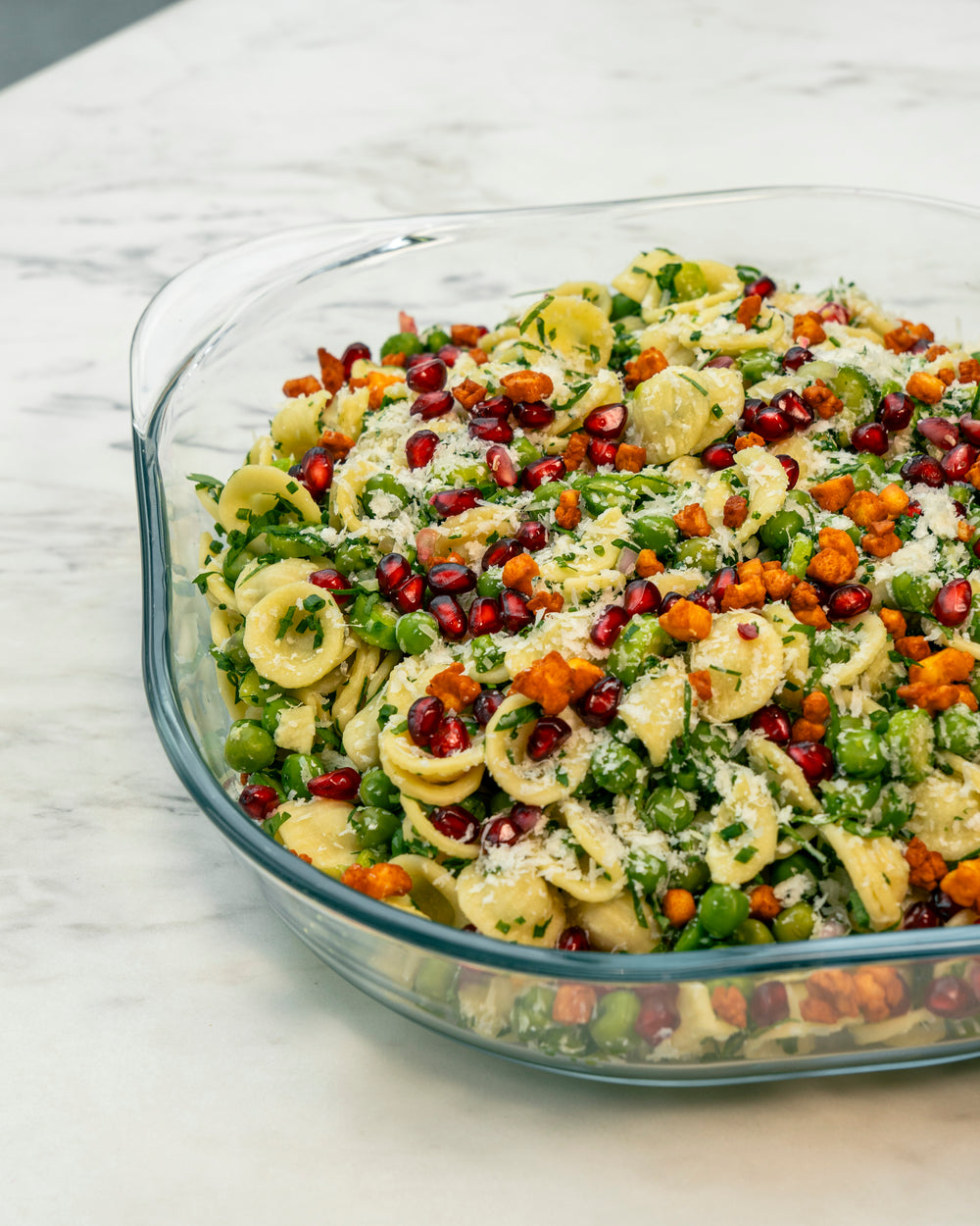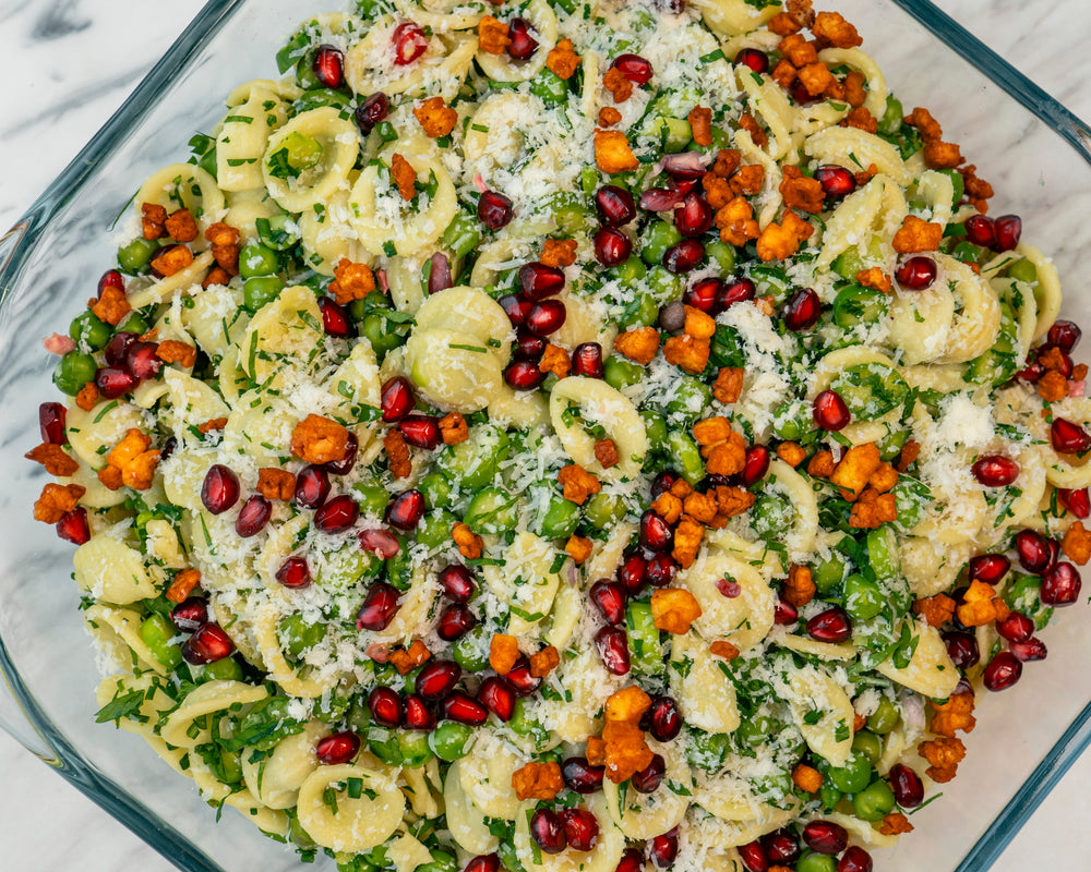 Orecchiette pasta with green peas, asparagus, and fresh herbs. with yogurt herb and avocado dressing. Garnished with crispy halloumi, pomegranate, and parmesan