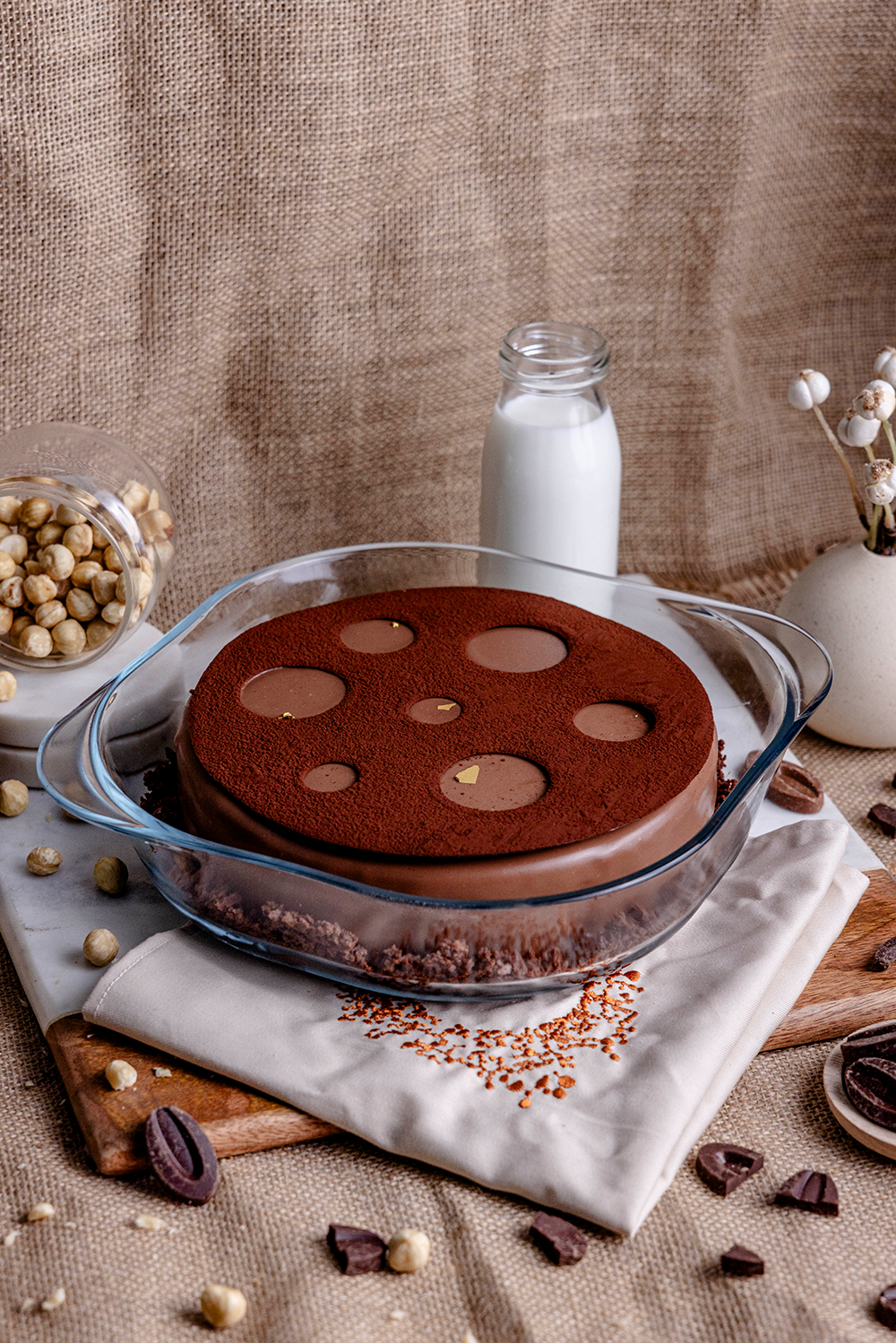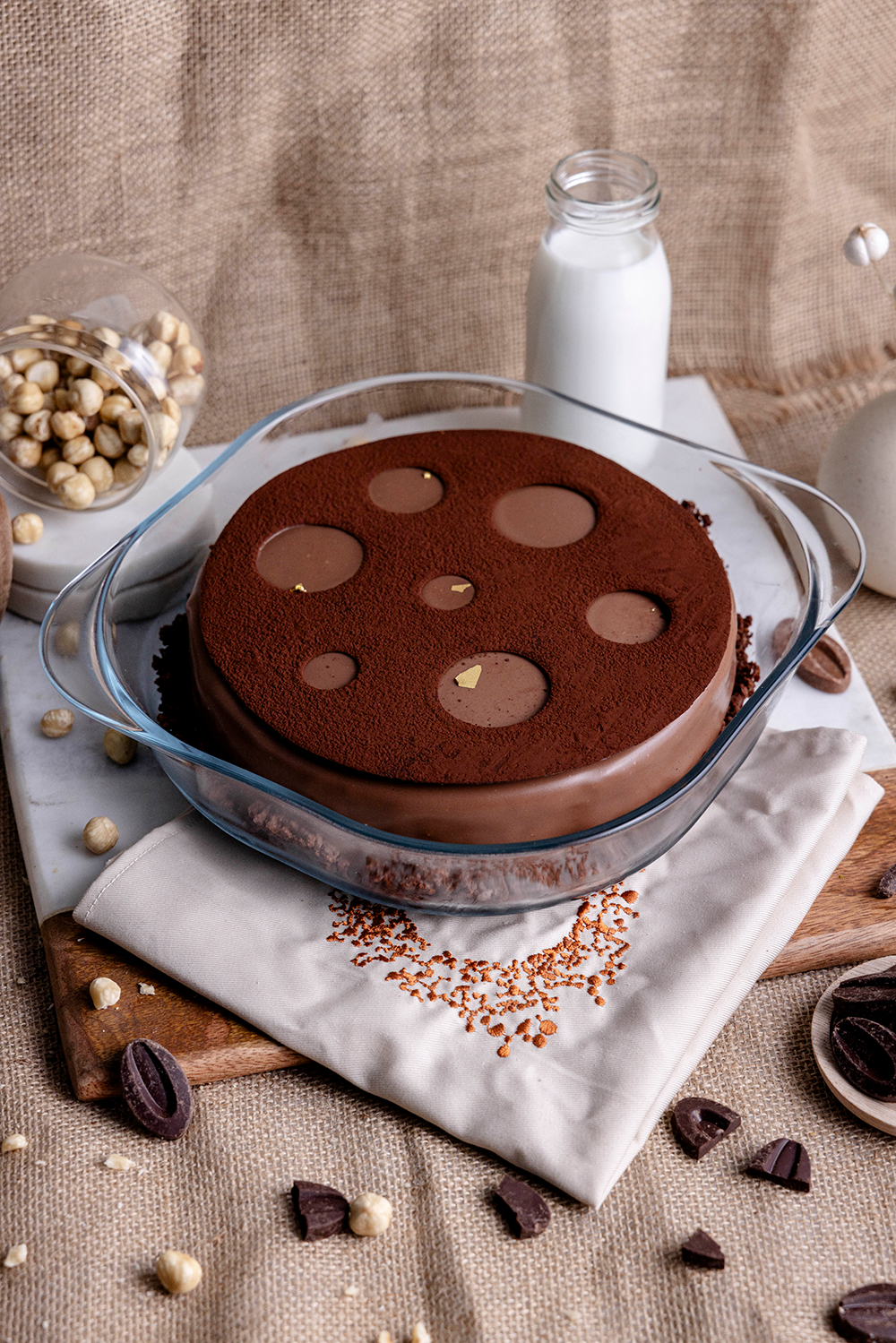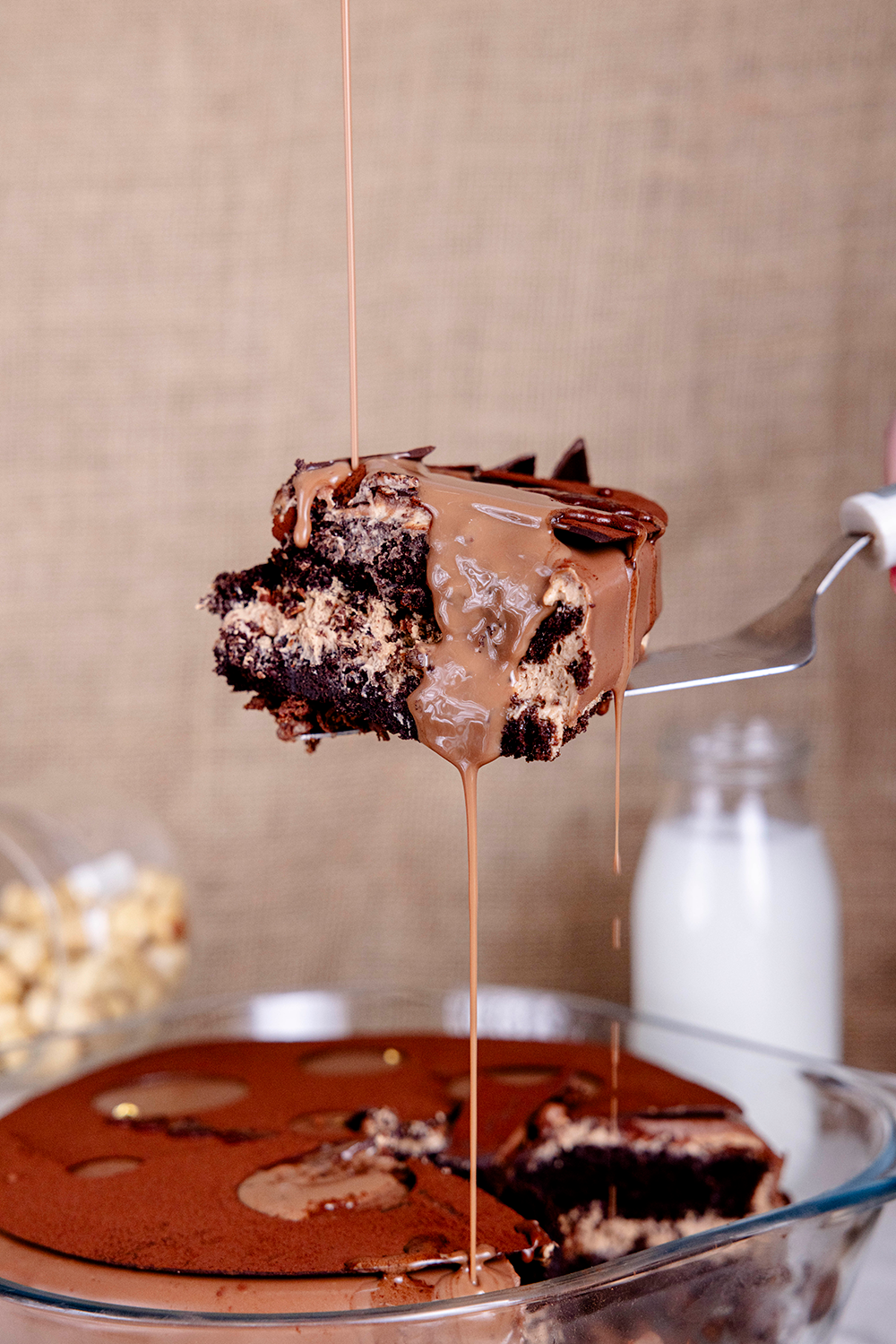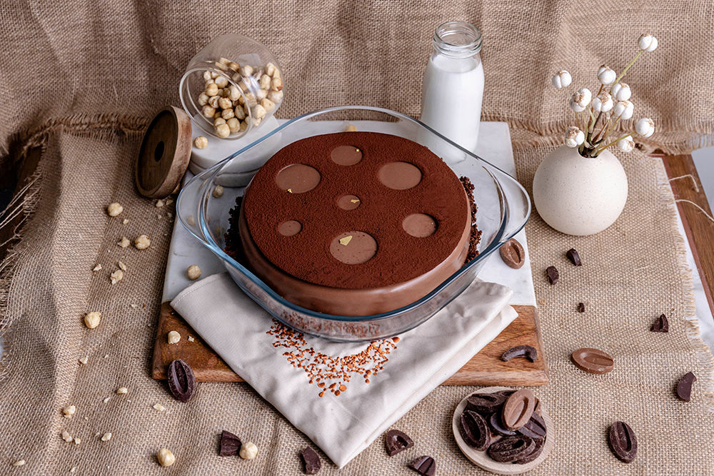 Chocolate chiffon sponge, soaked in chocolate milk sauce layered with hazelnut praline cruch and caramelia cremeux glazed with milk chocolate and served with warm salted ganache sauce