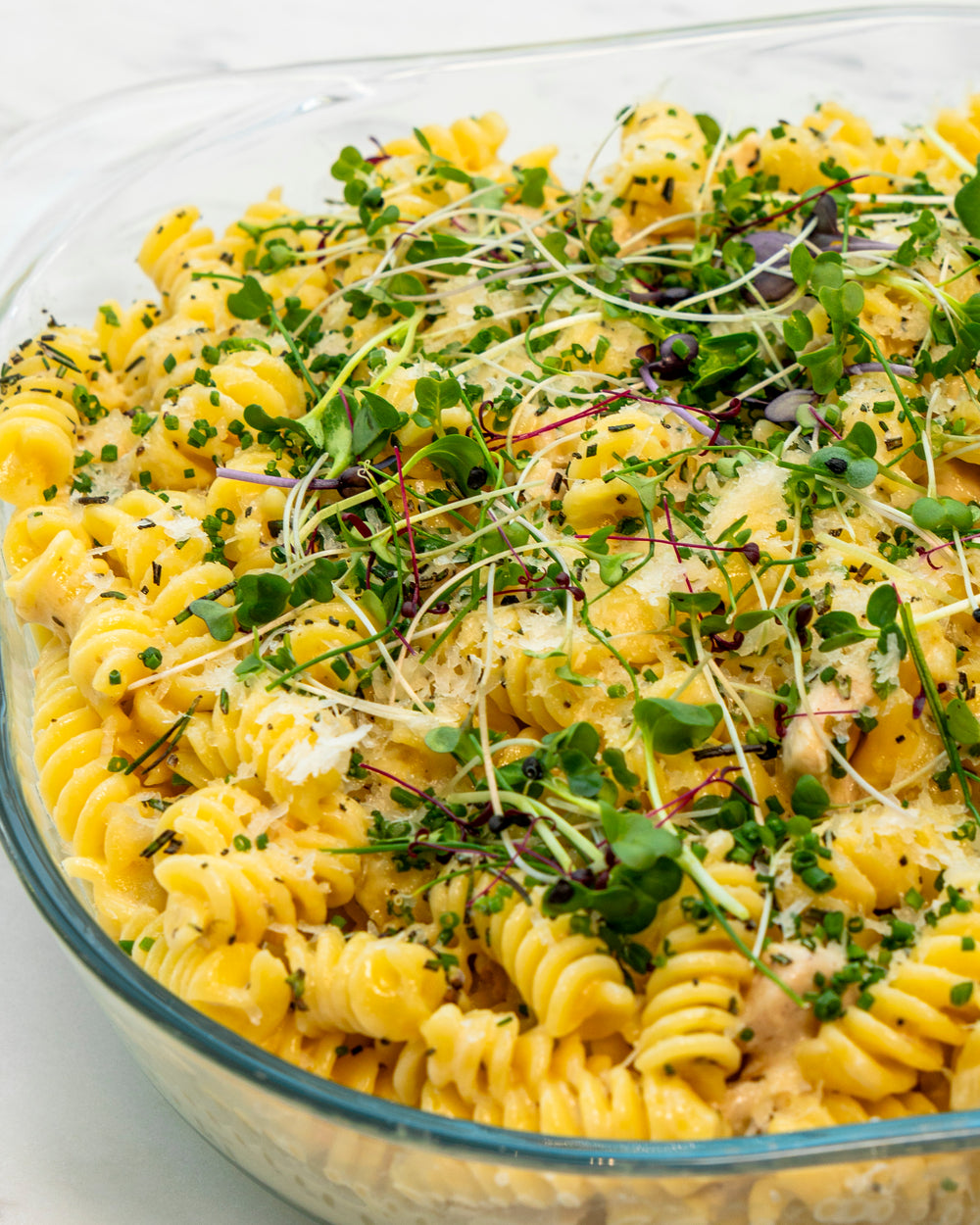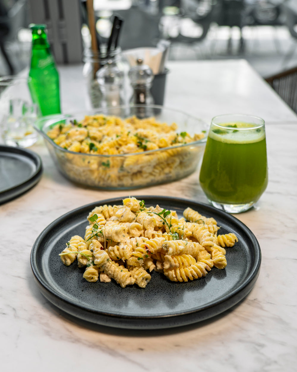 Marinated chicken breast with lime and lemon, labneh and sour cream served with fusilli pasta