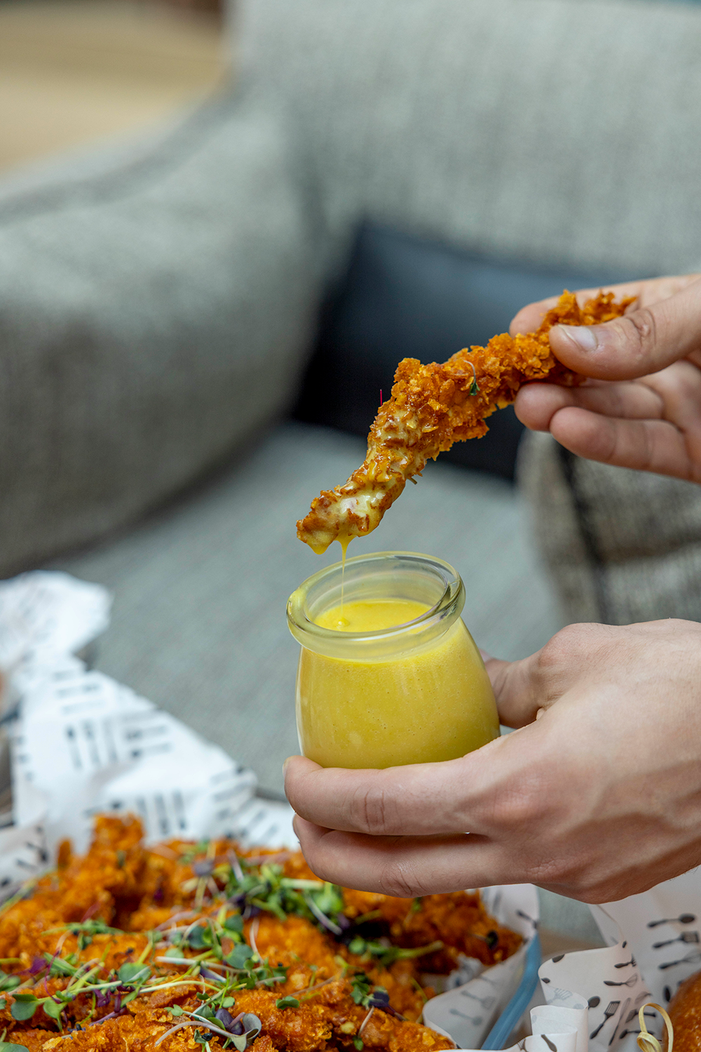 Homemade chicken nuggets, marinated with a special HBK sauce, coated with crunchy crisps, served with honey mustard sauce
