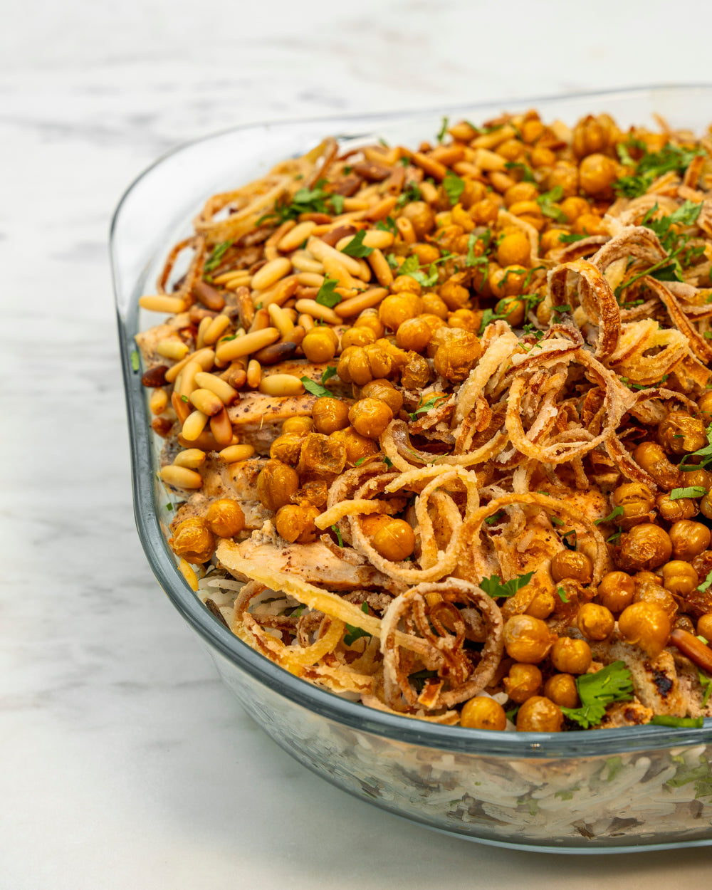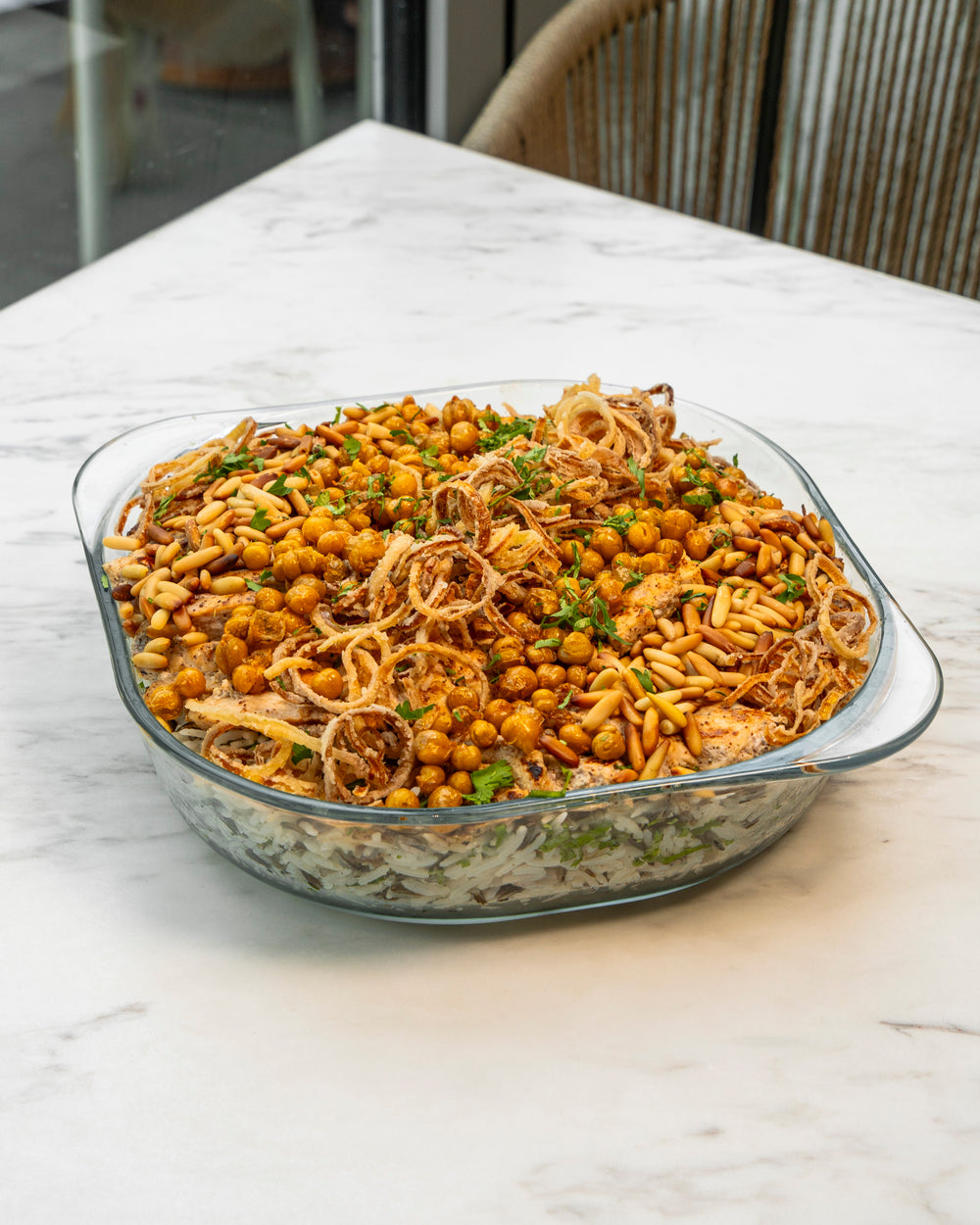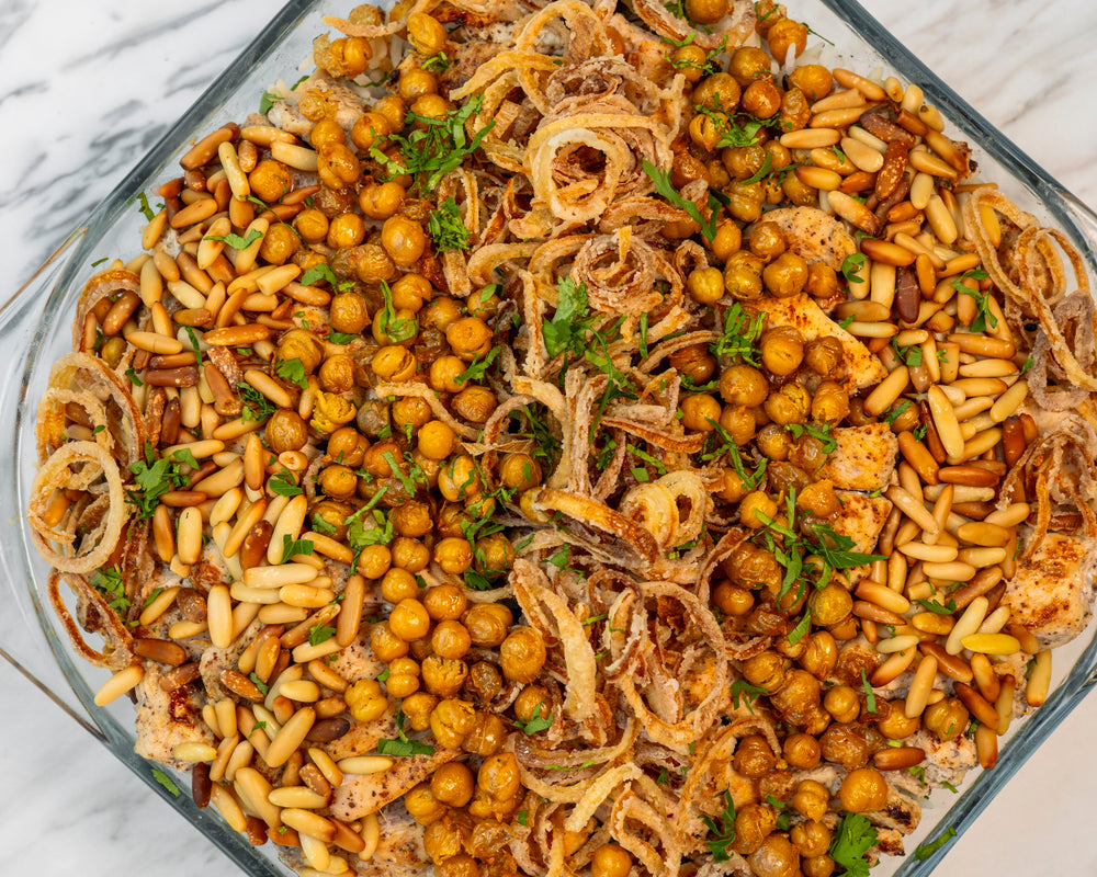 Chicken breast with zaatar, lemon, and sumac marinated overnight, served with pine nuts, fried chickpeas and fried shallots, drizzled with citrus sauce