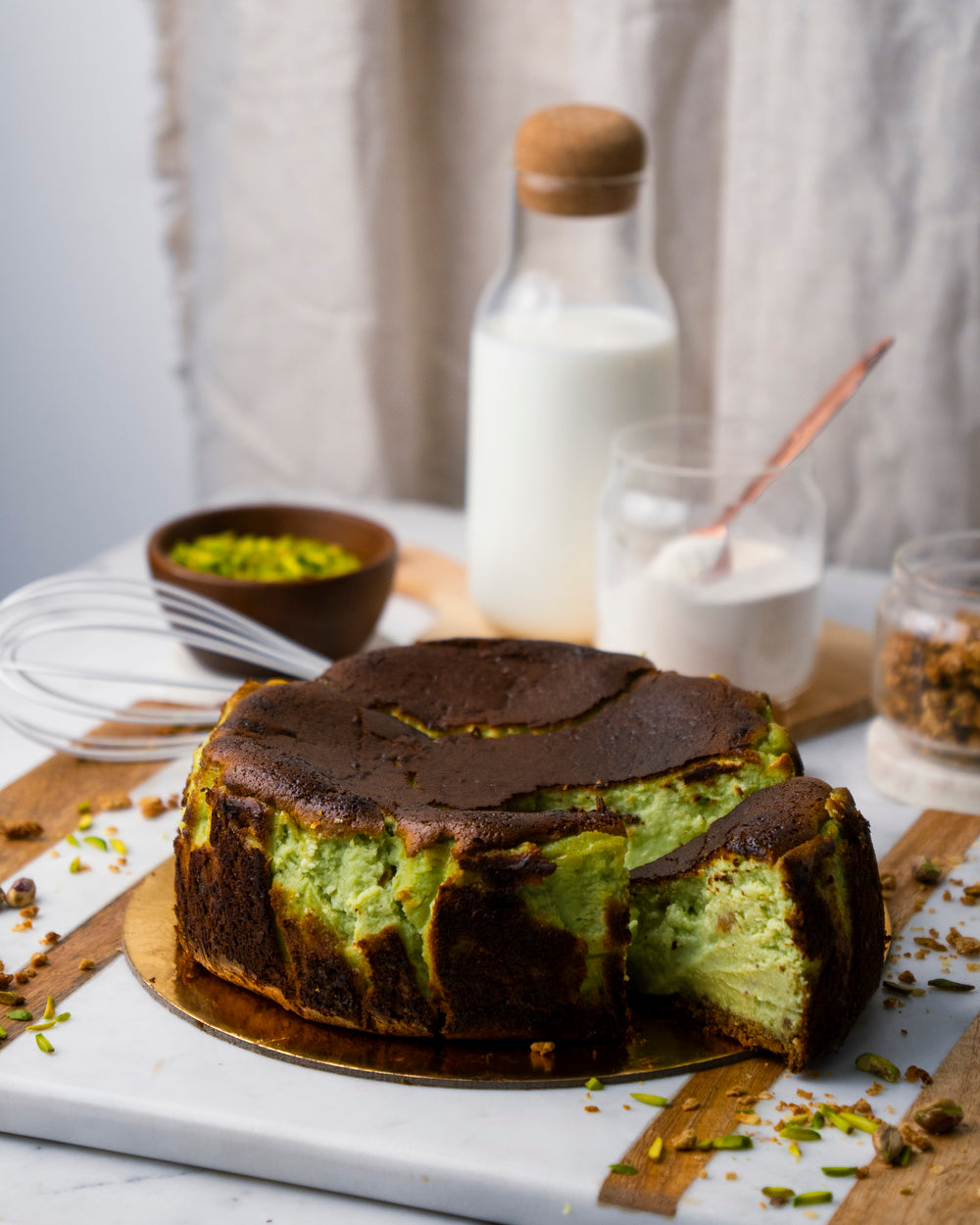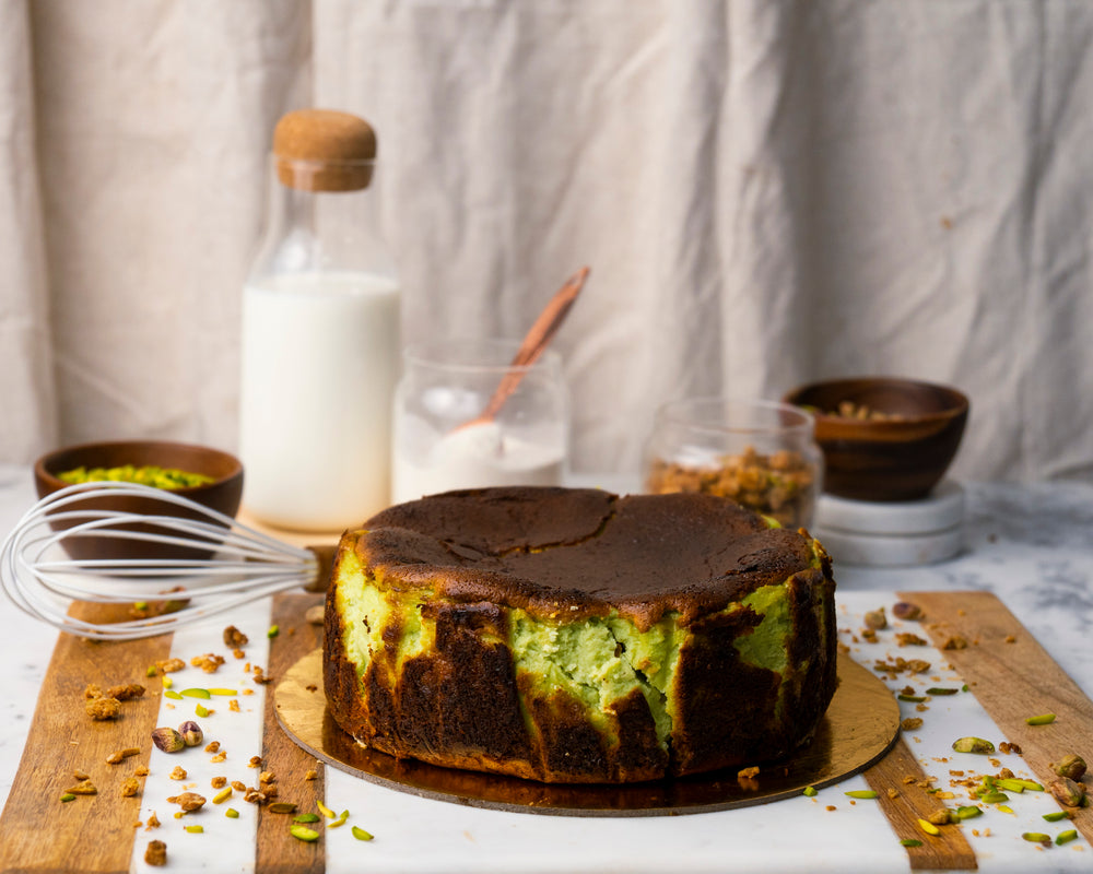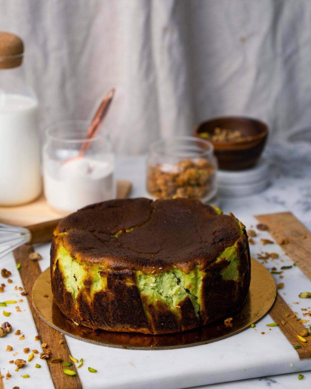 Pistachio baked cheesecake with a crunch granola and biscuit base
