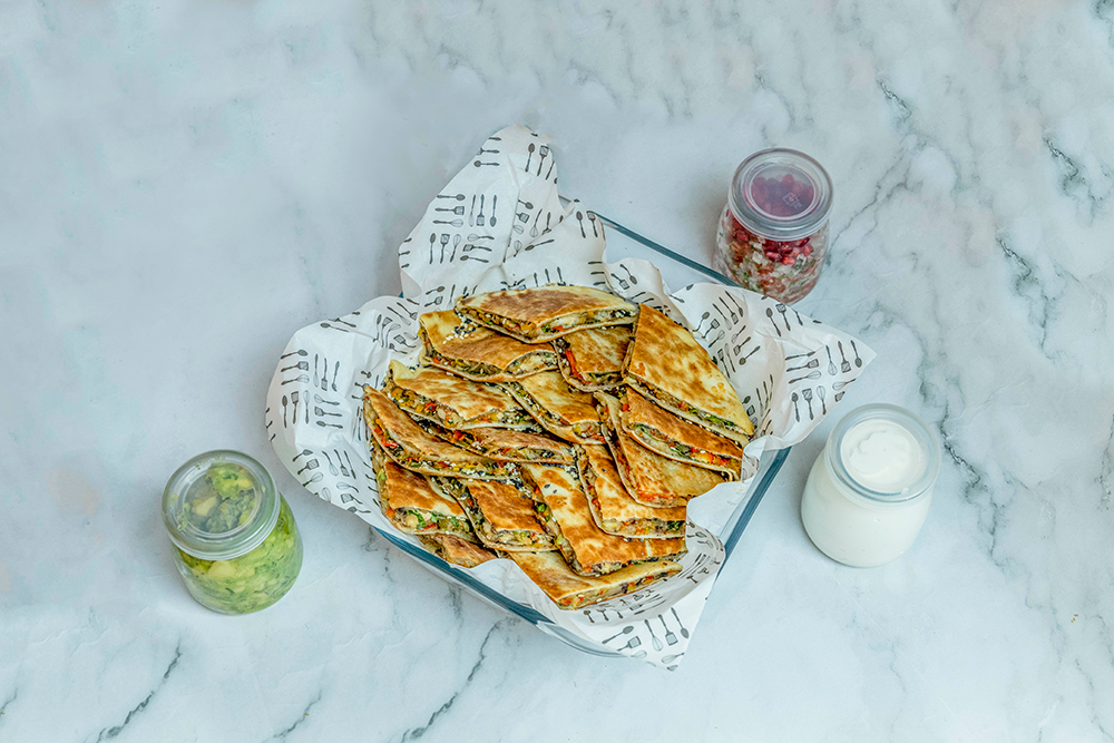 Pita bread stuffed with mixture of chicken fillet, onion pepper mix, black bean paste, served with pomegranate pico de galo, guacamole, sour cream on the bed of the Romain lettuce
