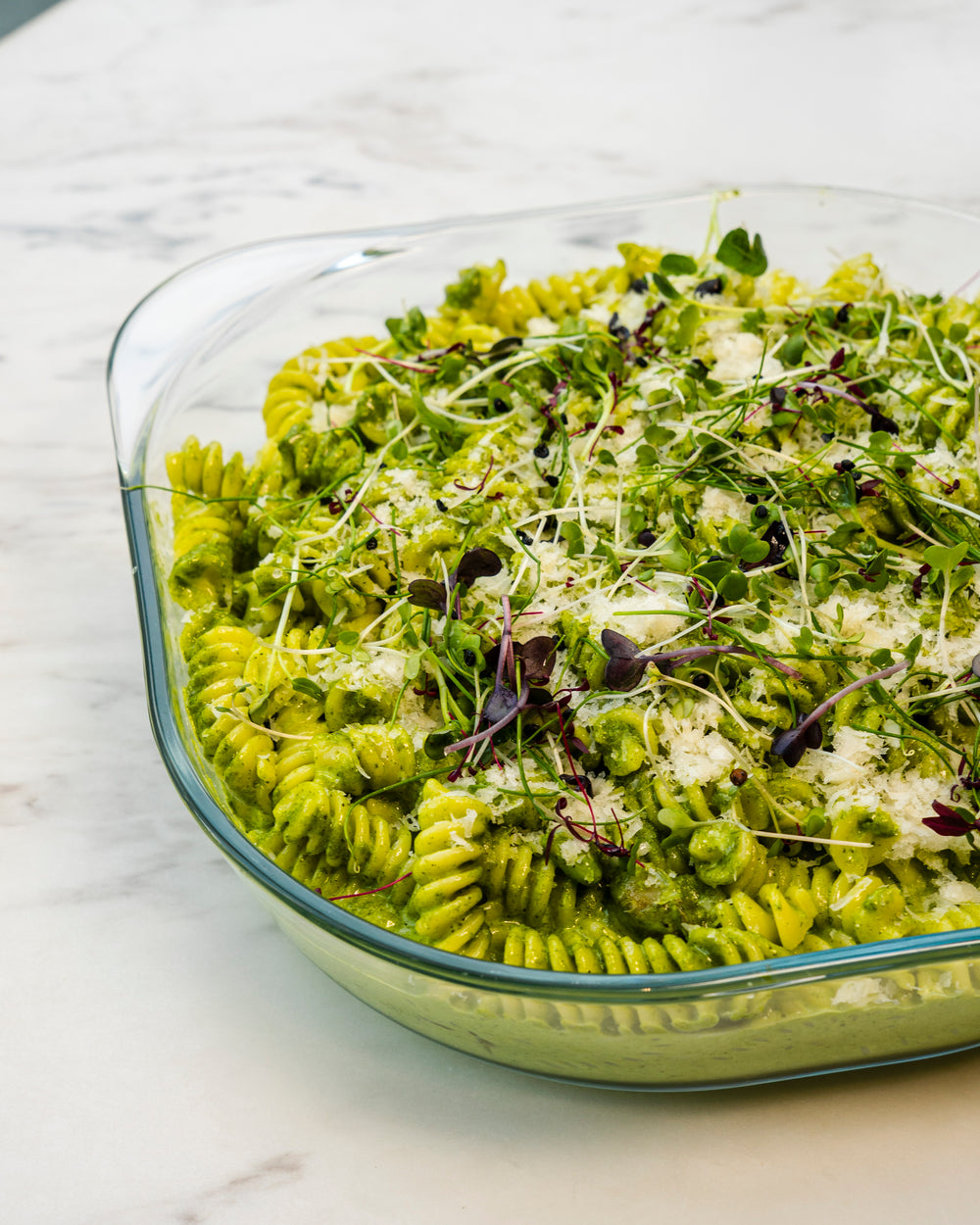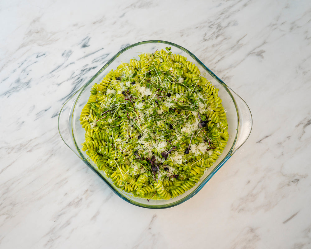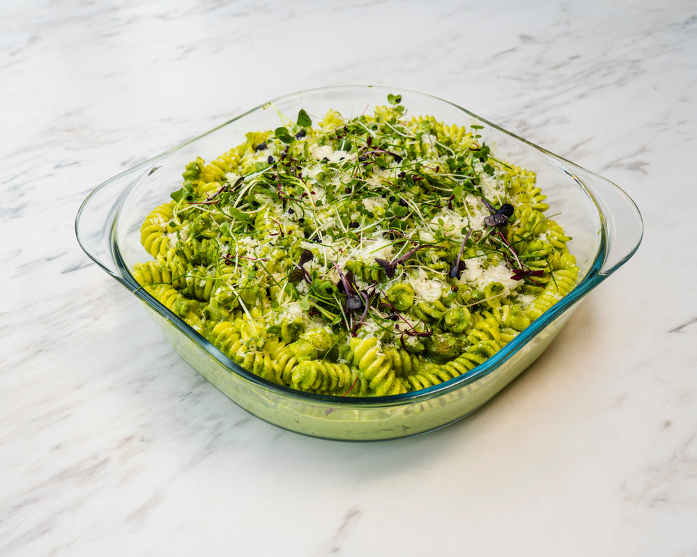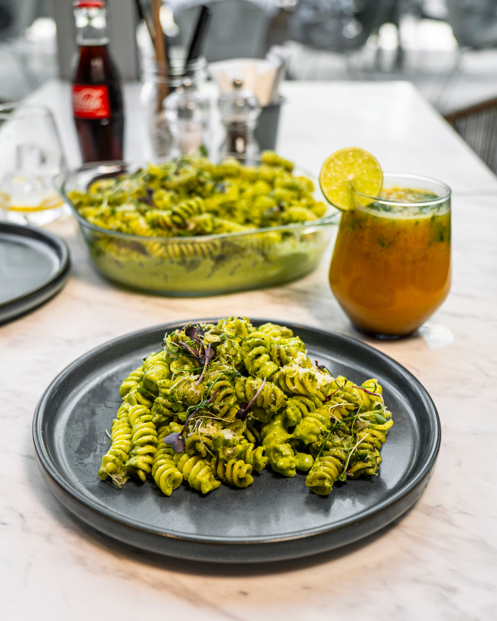 Fusilli pasta served with our very special green sauce made of parsley spinach, zucchini, coriander and Rocca leaves. It also comes with edamame beans