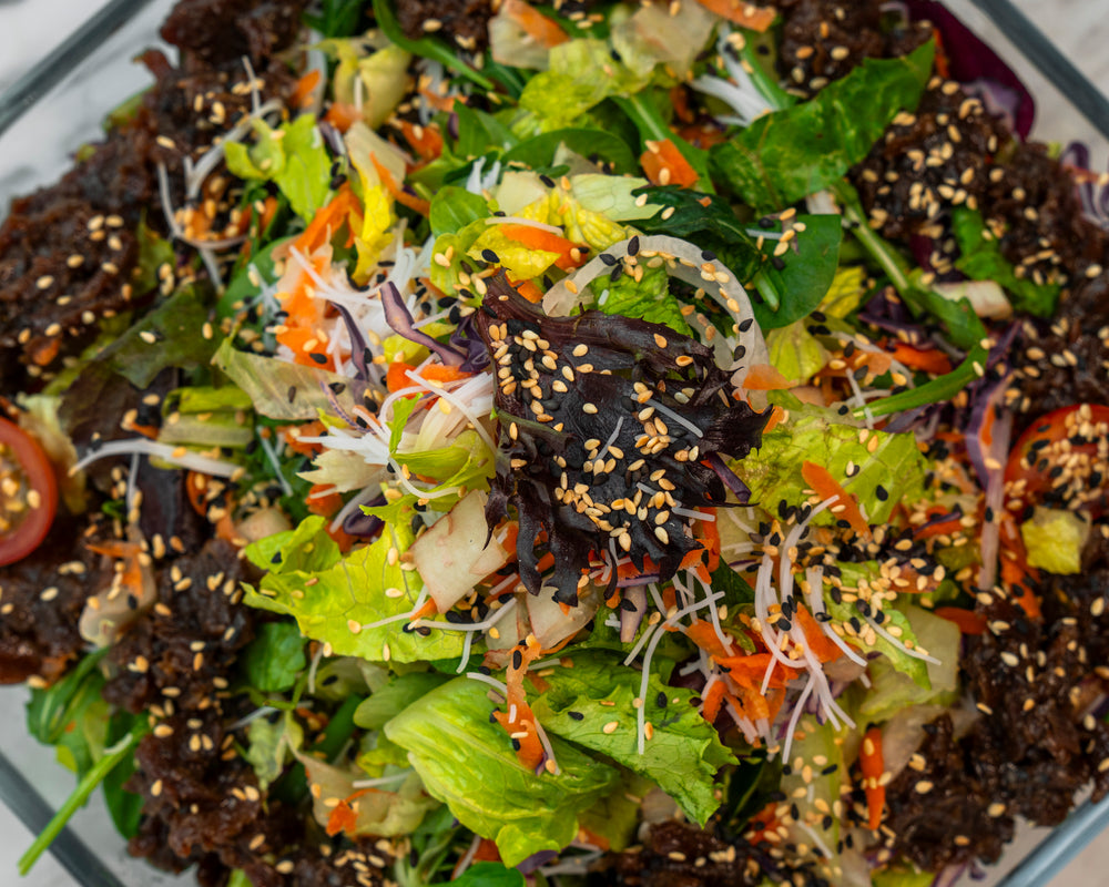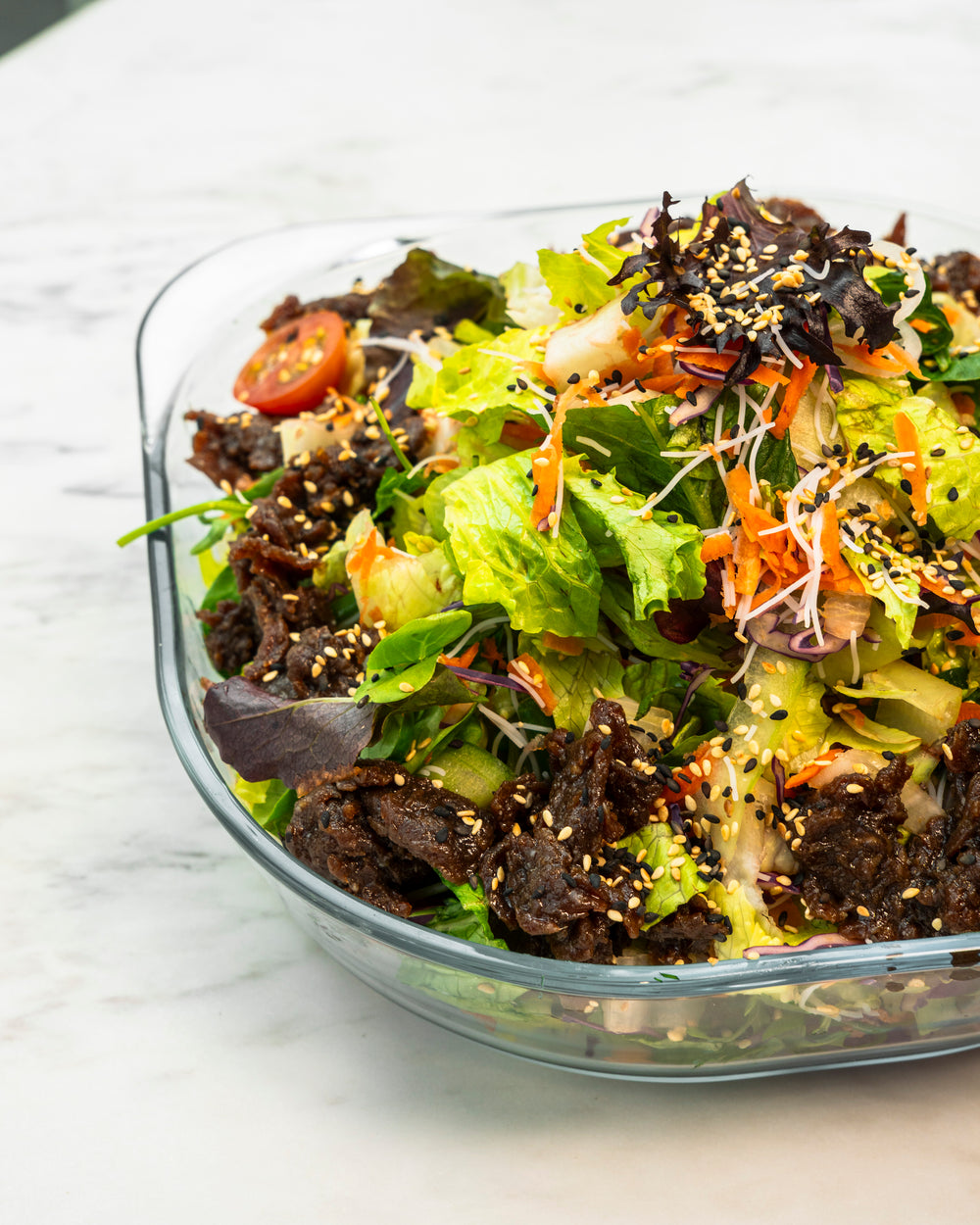 Mix vegetables (cabbage, carrot, lettuce, onions, kenya beans), rice noodles with ginger honey dressing, stir fried striploin, sesame seeds, and peanut dressing