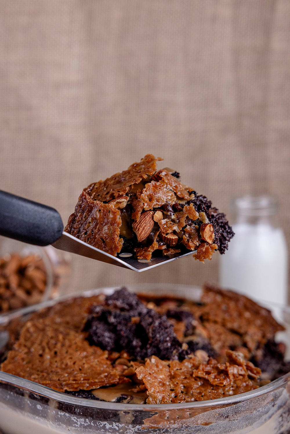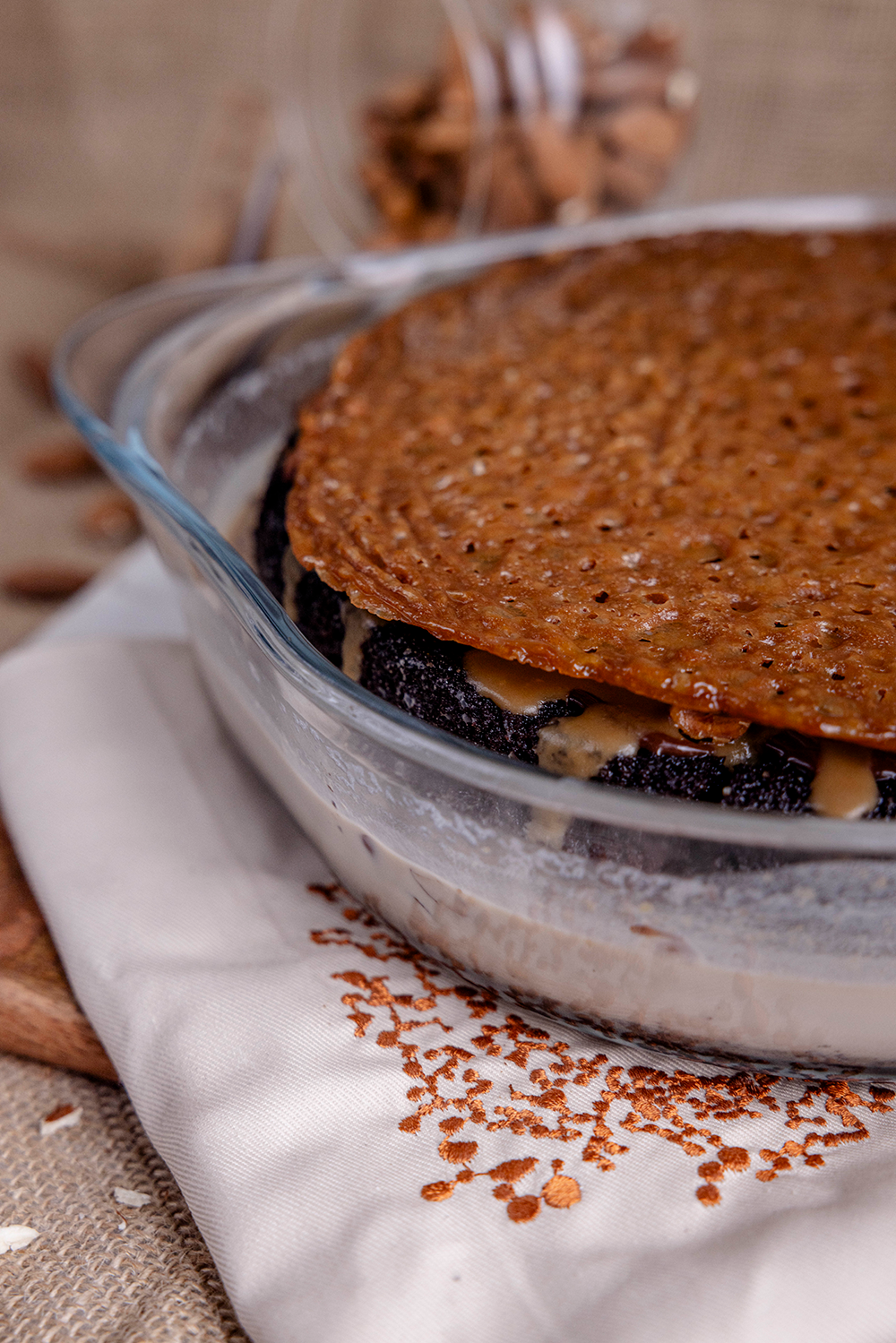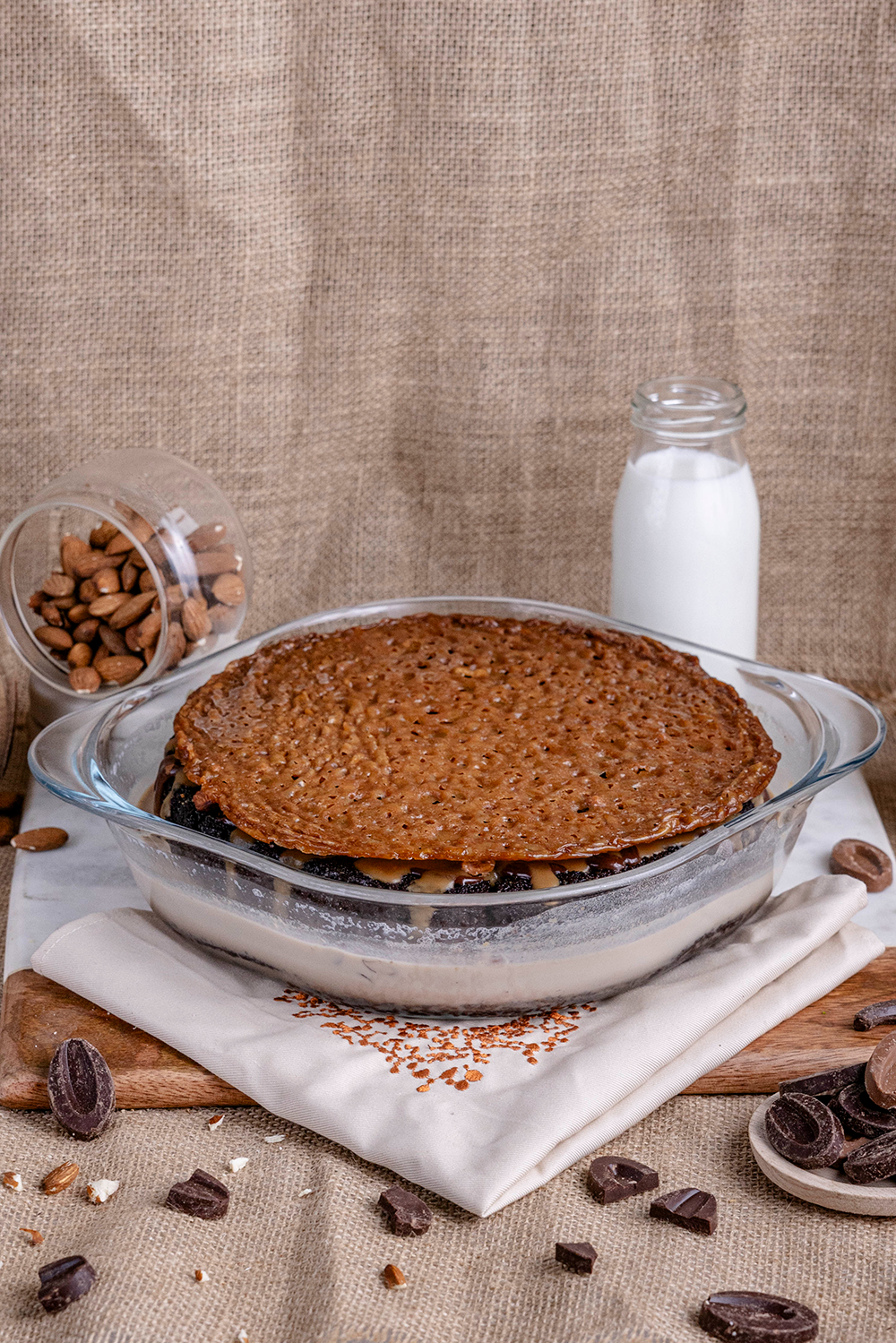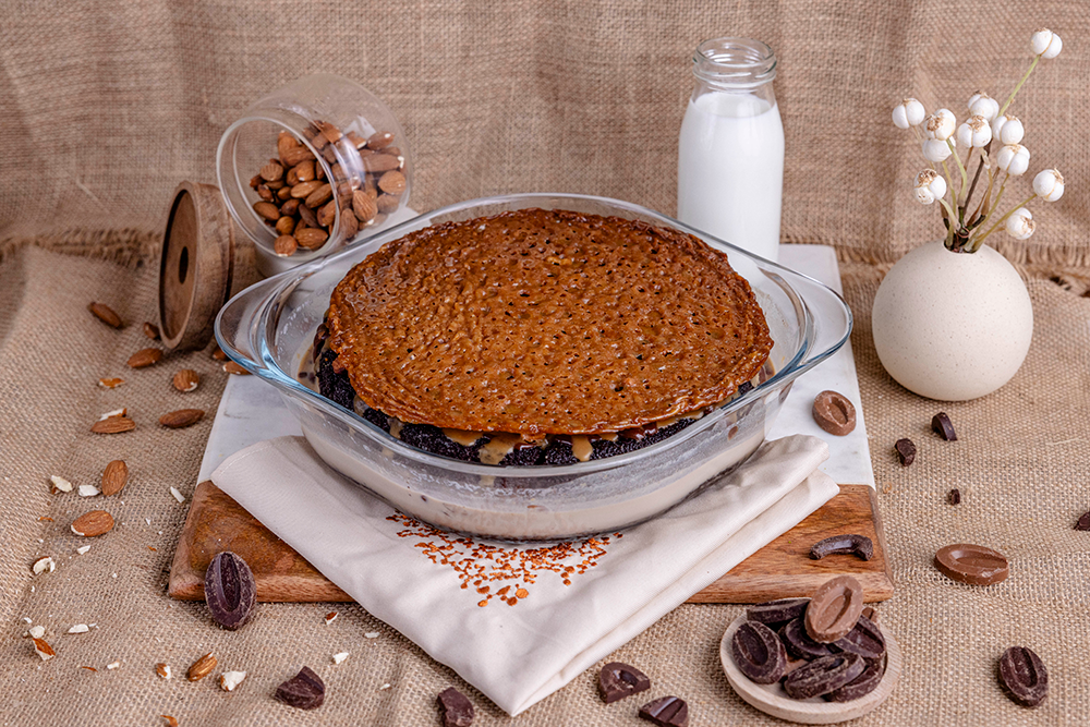 Chocolate cake filled with Nutella, covered with cream and milk chocolate, topped with vanilla ice cream, roasted almond, milk sauce, and Nutella sauce