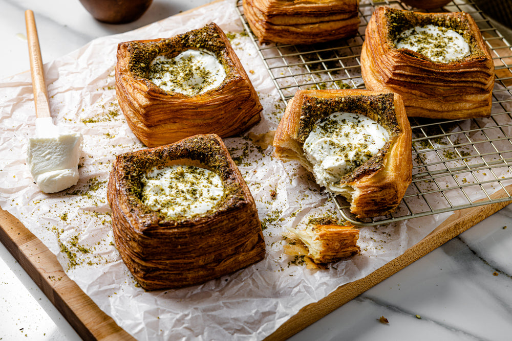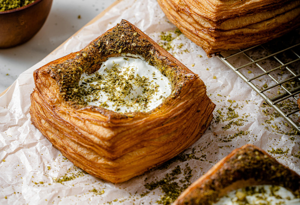 Layered of square croissant filled with Zaatar labneh mixture, topped with Zaatar powder