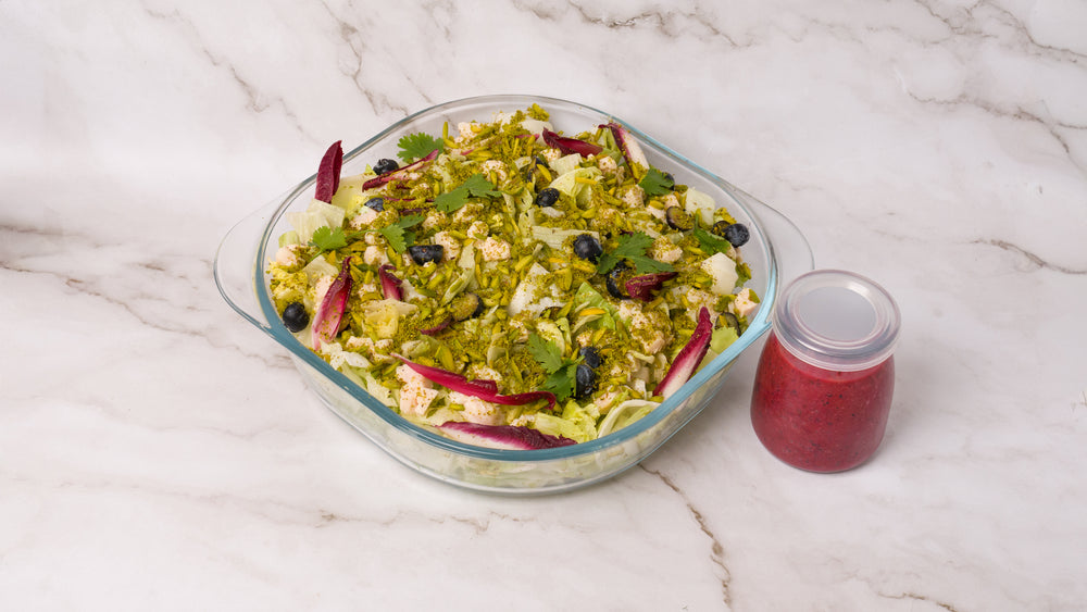 Lettuce salad with blueberry dressing and coconut infused chicken. Served with fresh blueberries, pistachio, and endives