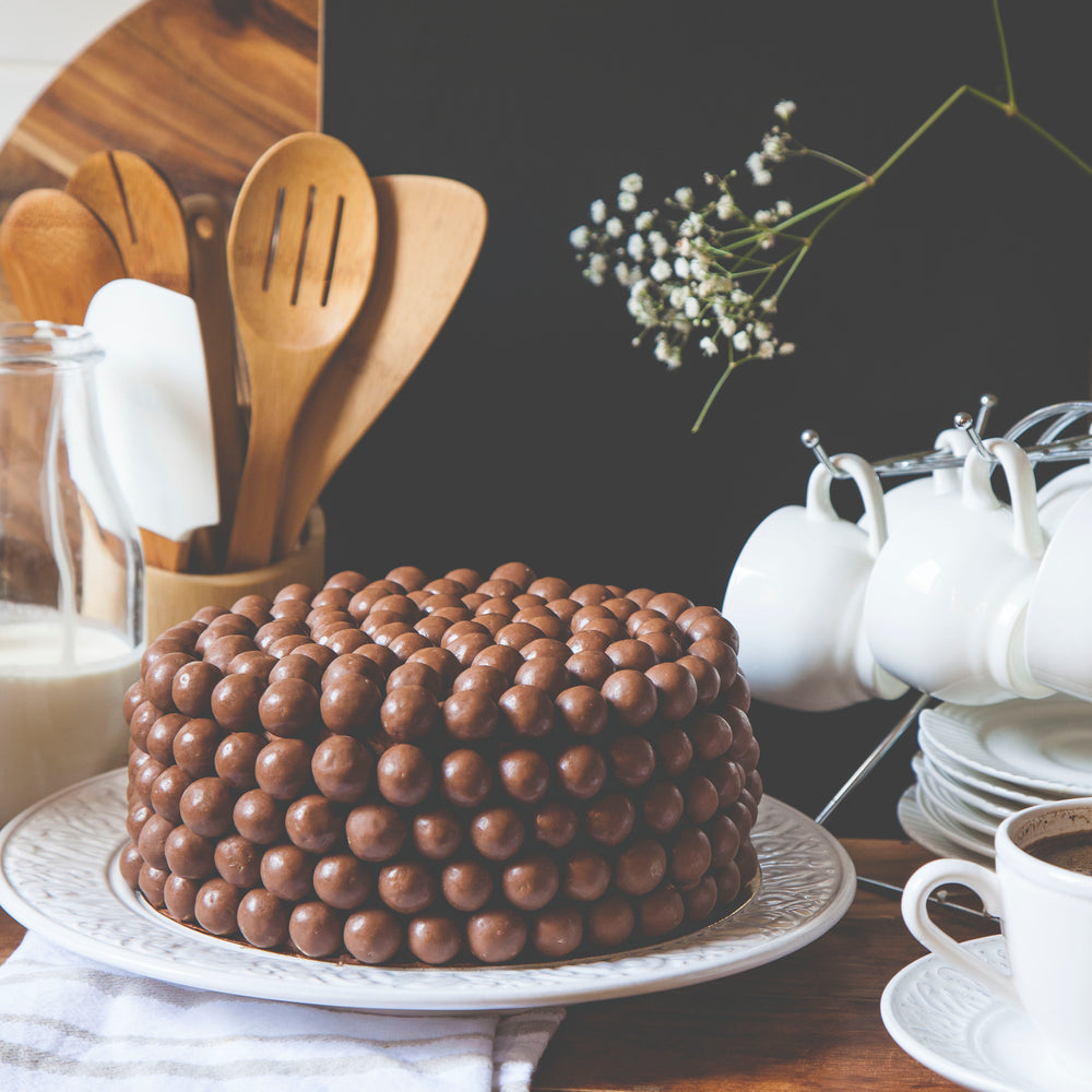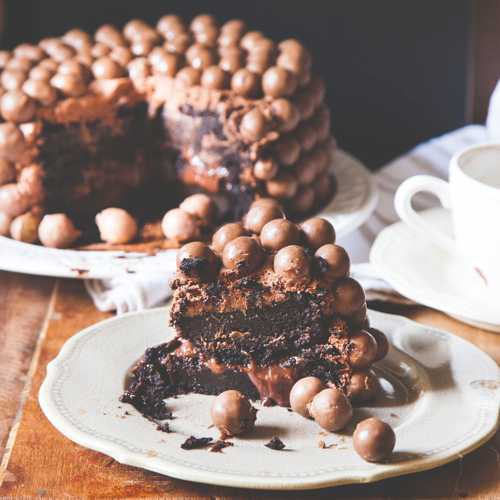 Malty chocolate sponge sandwiched between a malt ganache and covered with Maltesers chocolate