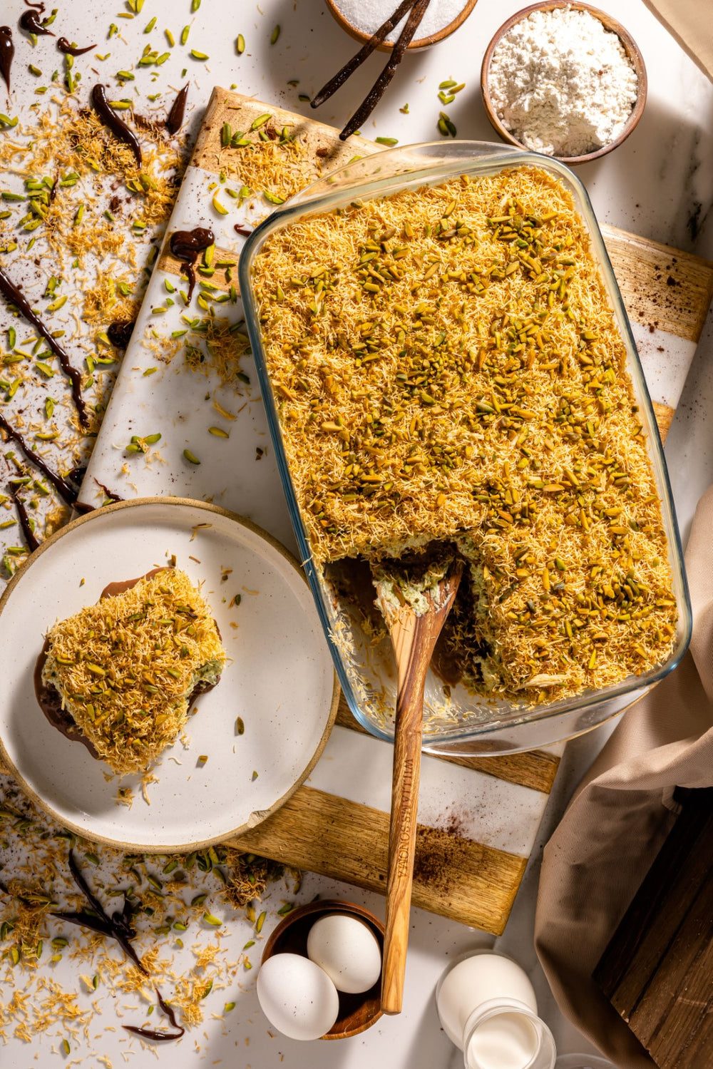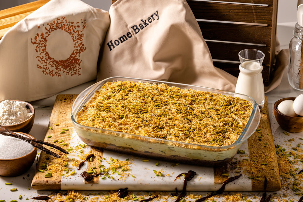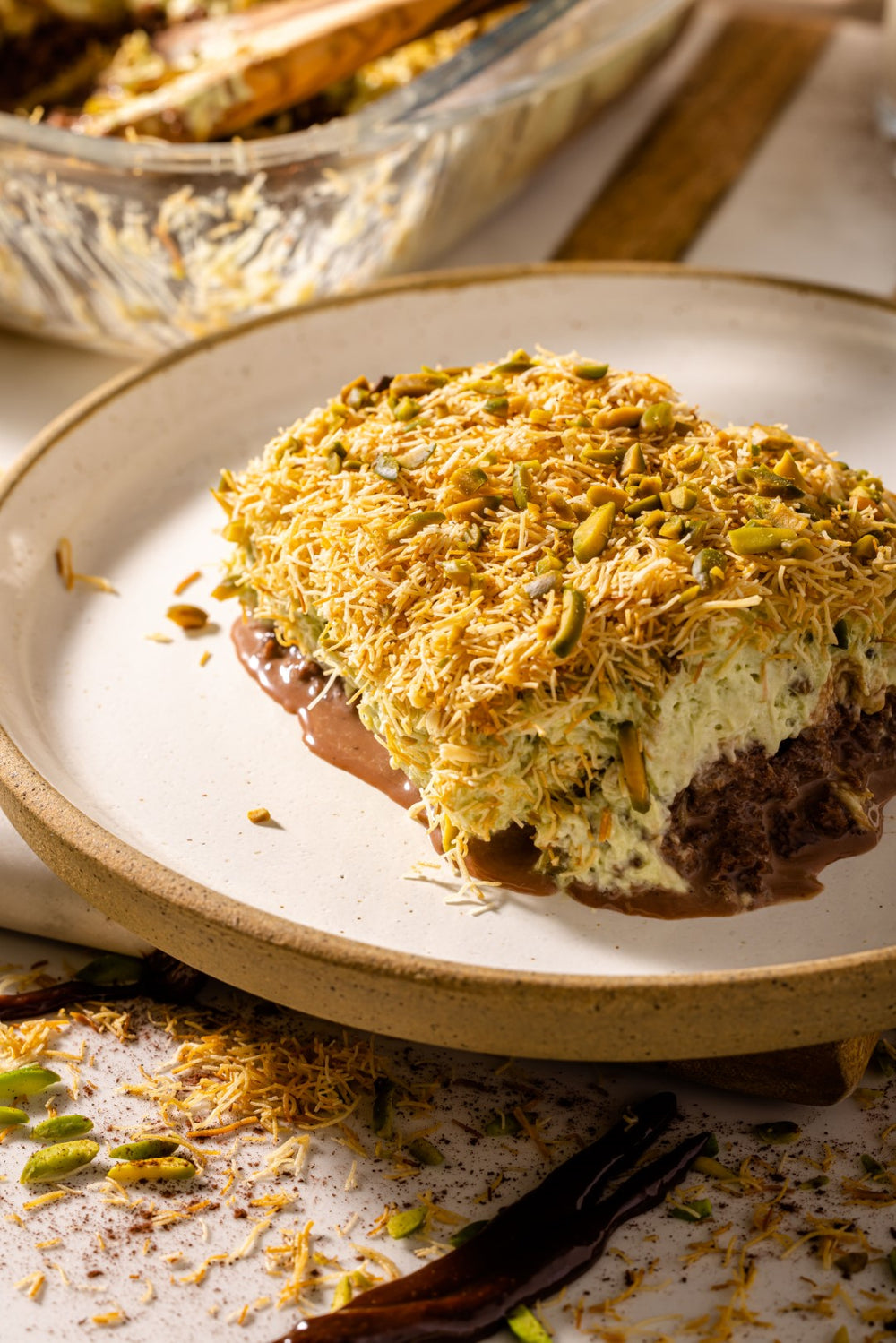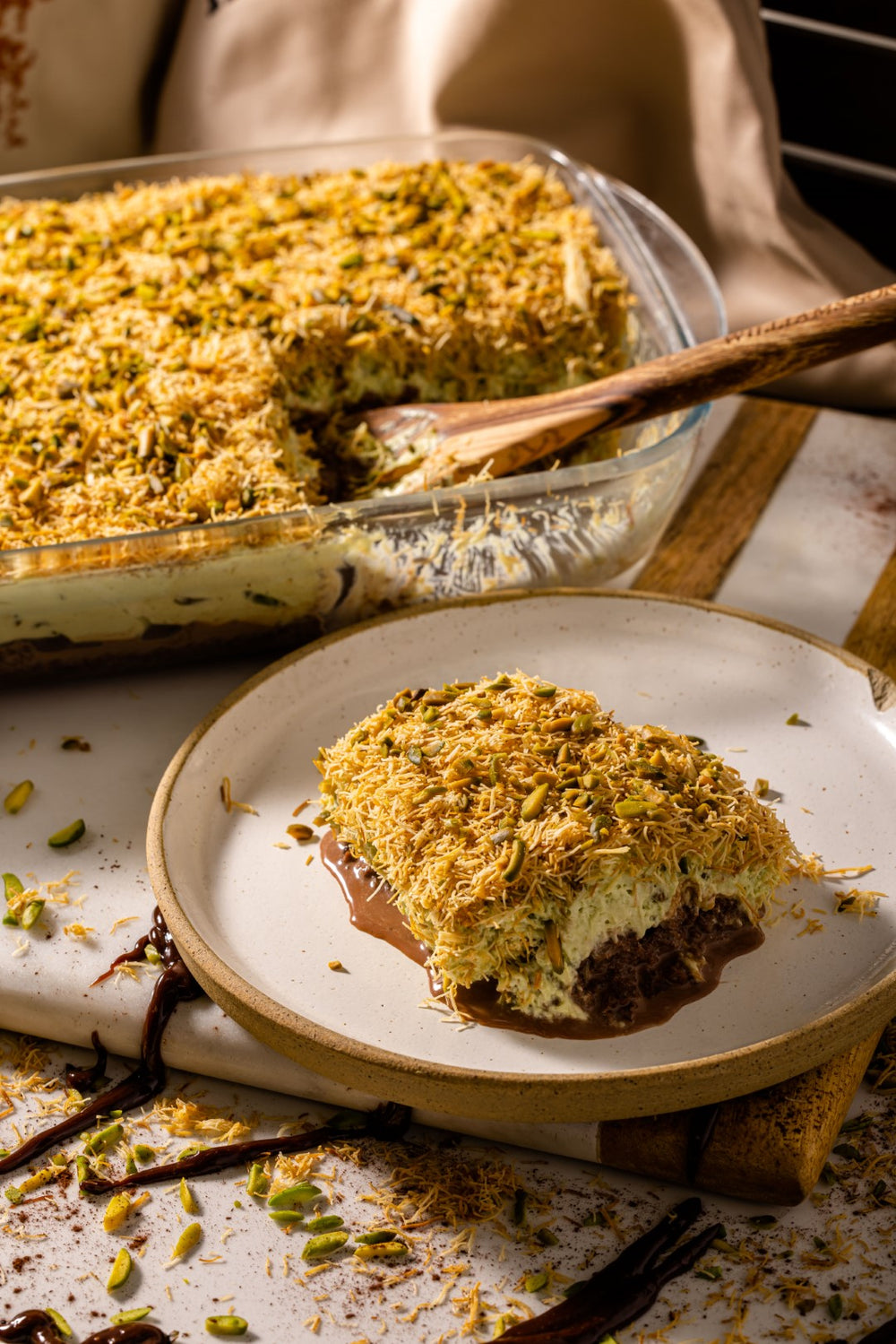 Chocolate sponge soaked in hazelnut sauce, topped with pistachio cream, pistachio slices and toasted kunafa