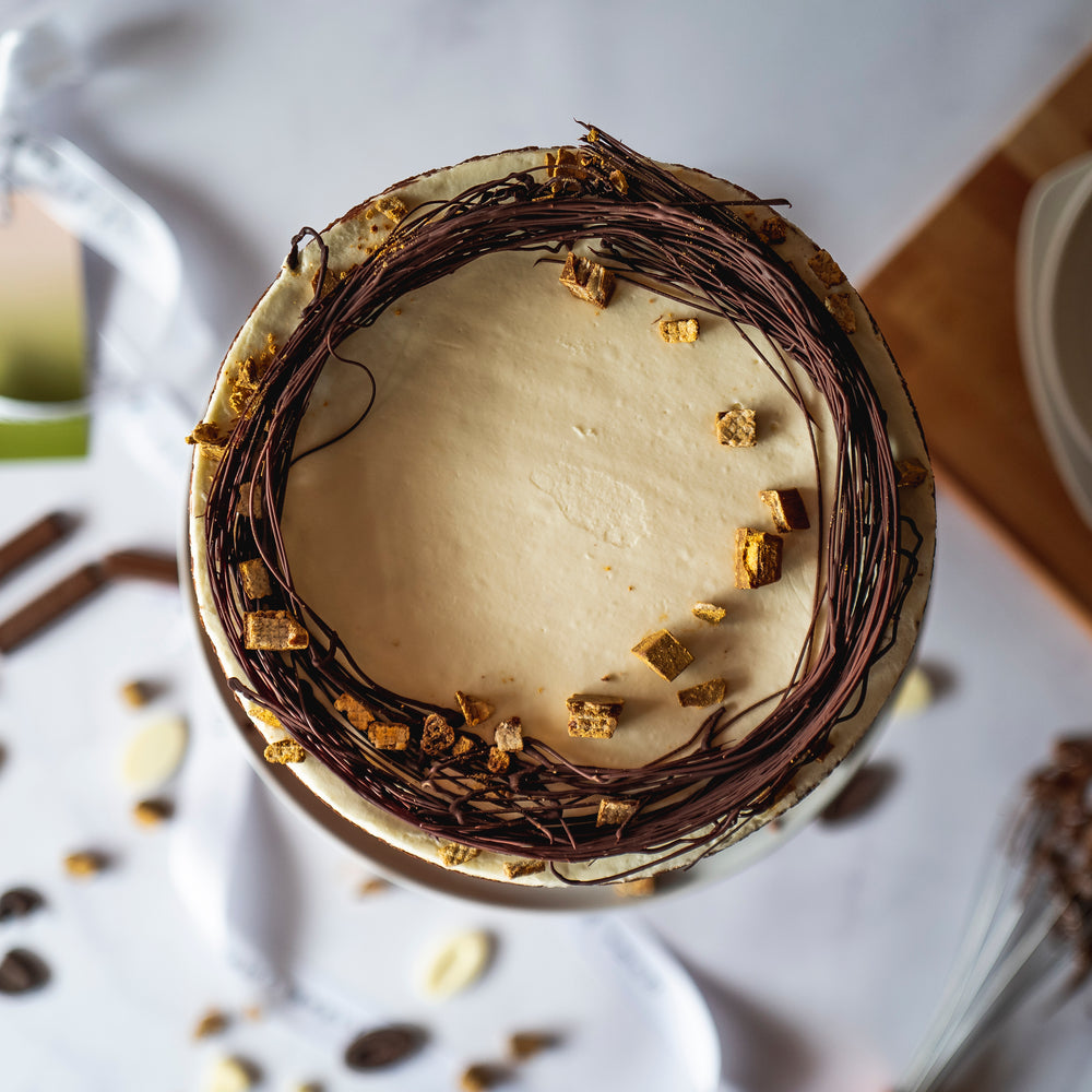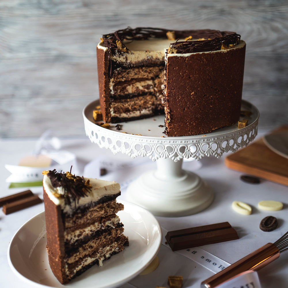Chocolate wafer layered between chocolate and ice cream mixture sponge cake, topped with white chocolate ganache, garnished with dark chocolate