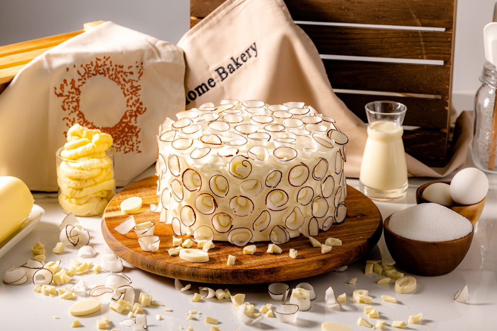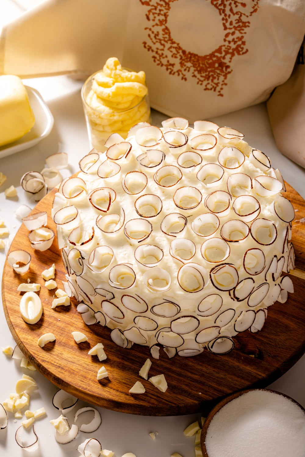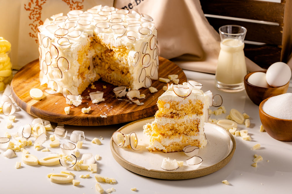 Layers of coconut sponge cake, coconut ganache, coconut mousse, and coconut crunch