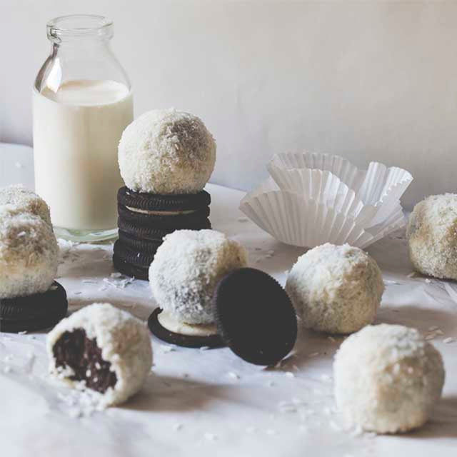 Oreo based dessert coated with white chocolate and shredded coconut (20 pcs)