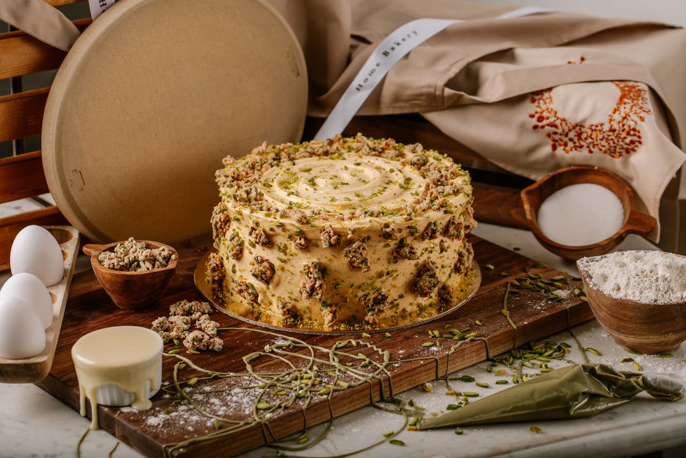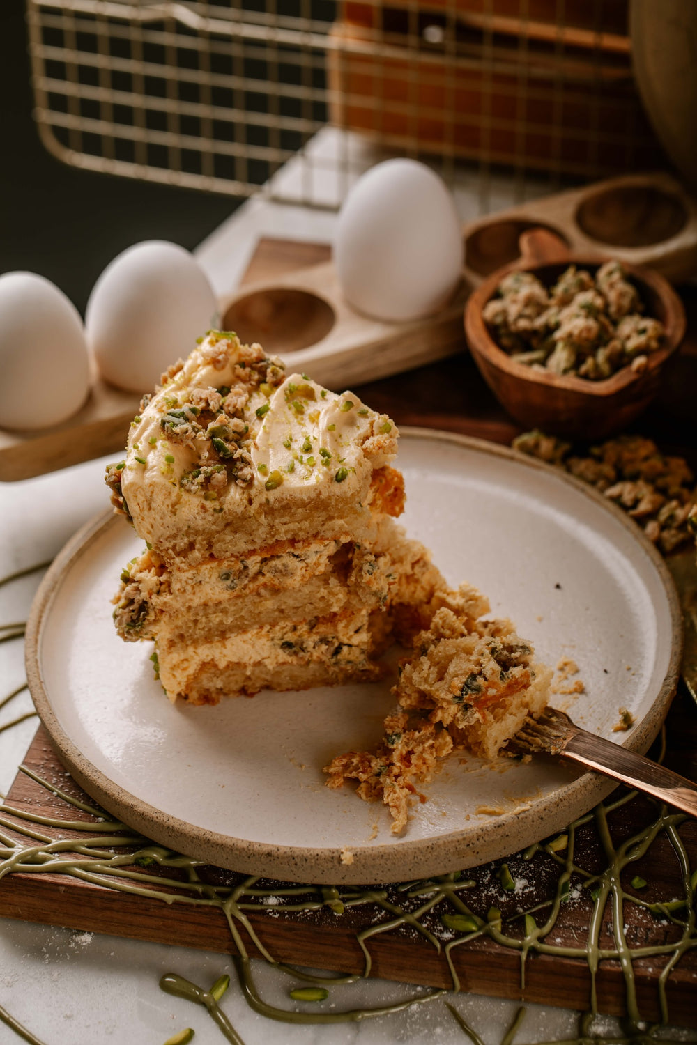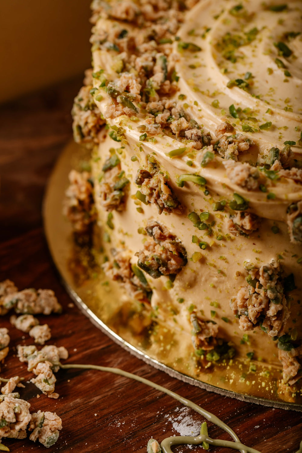 Layers of pistachio sponge cake, light pistachio cream filling and crunchy pistachio florentines and pistachio pieces