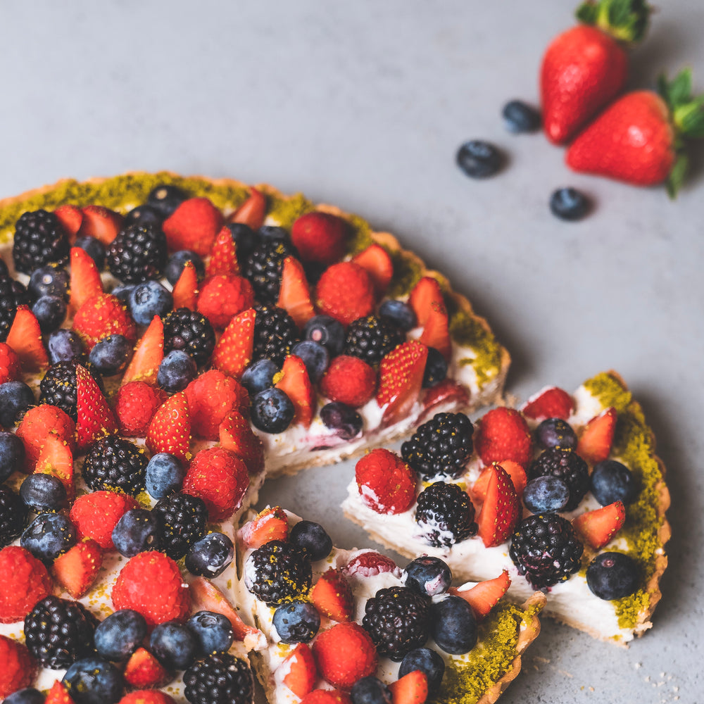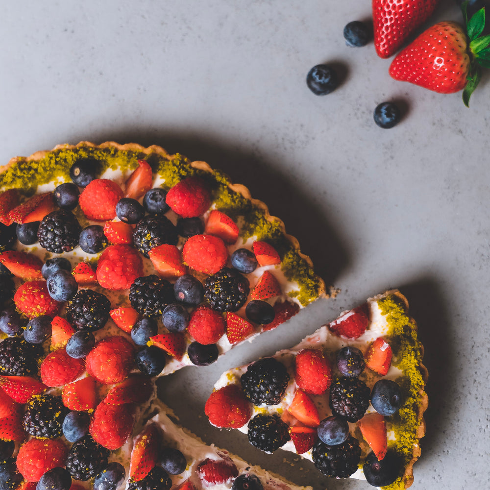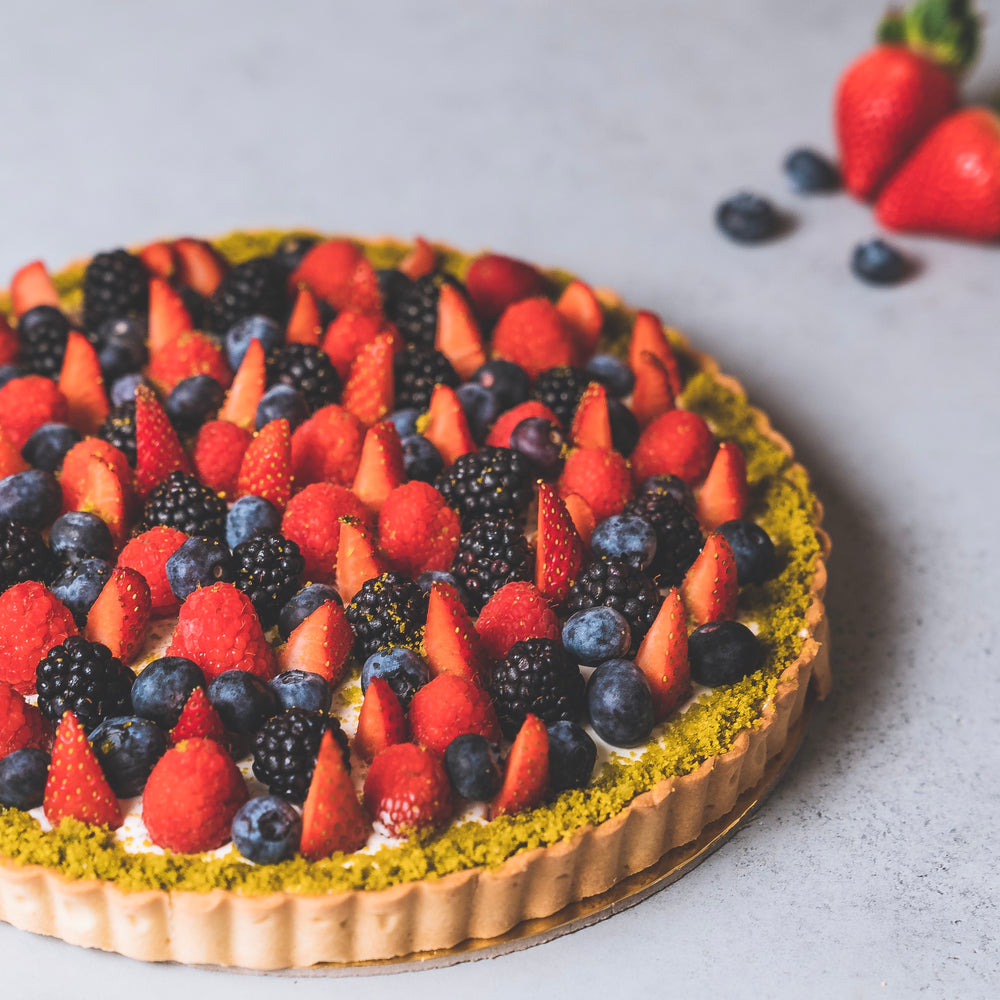 Shortcrust biscuit base with a light cheese filling with mixed berries and a sugar glaze, garnished with pistachio