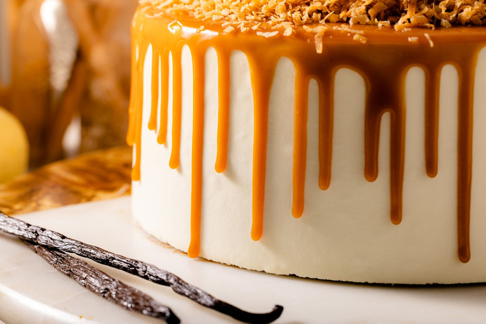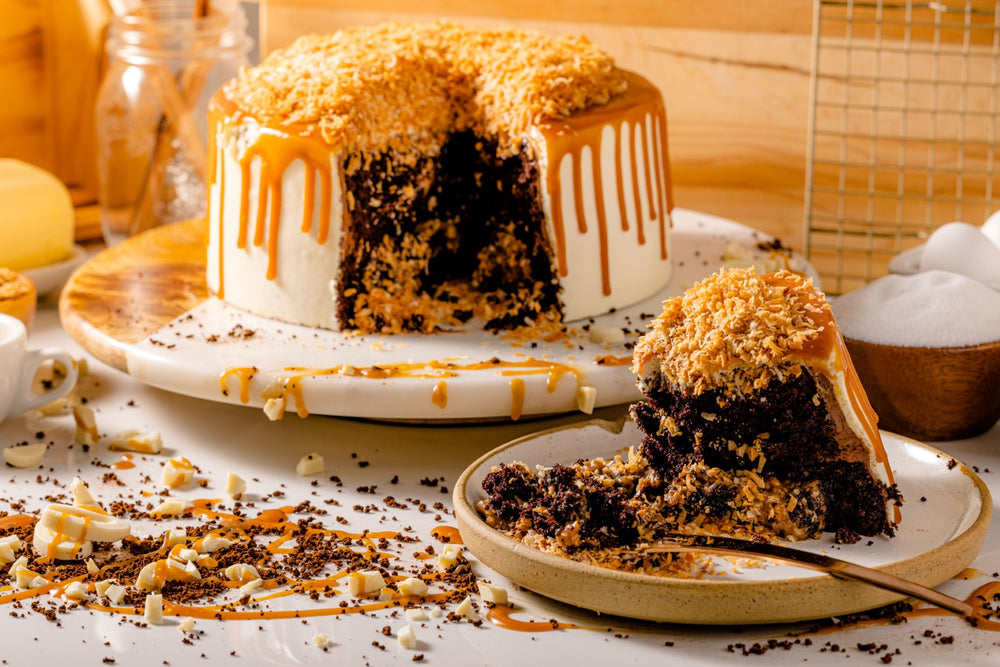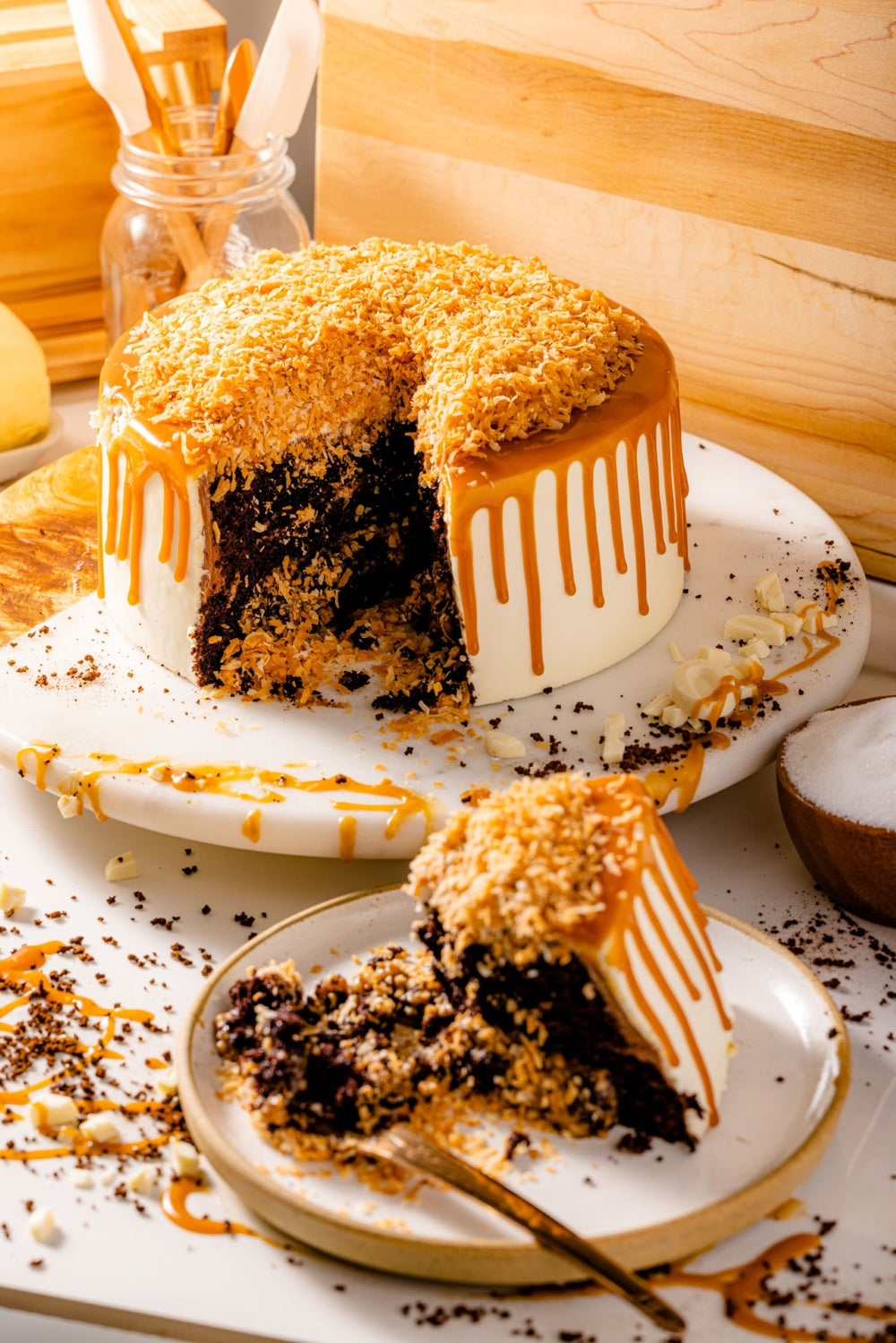 Moist chocolate cake with creamy caramel filling and white choco ganache, topped with shredded coconut