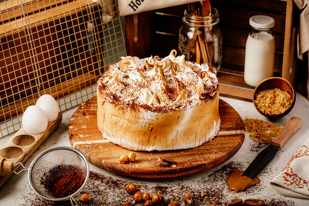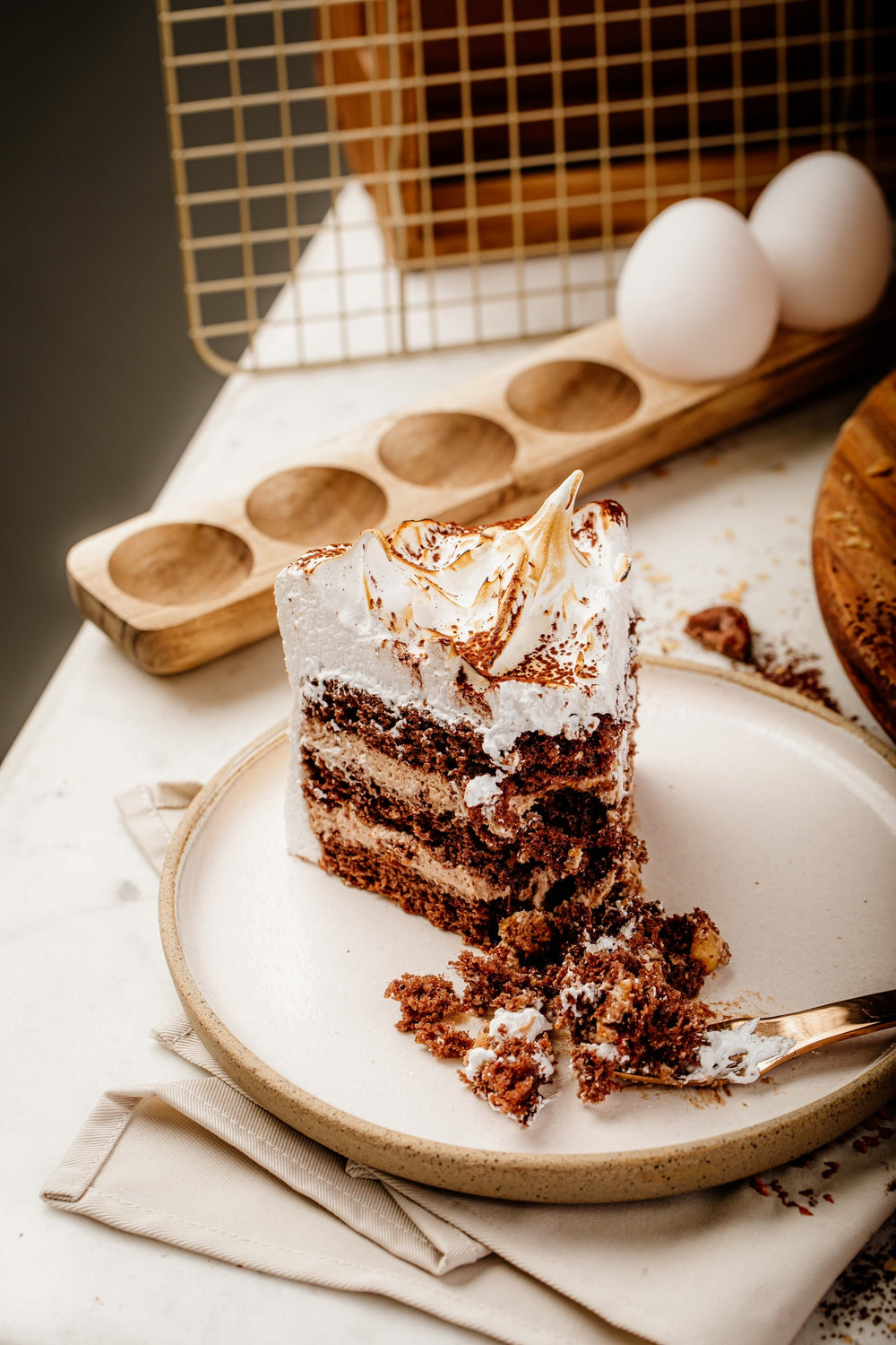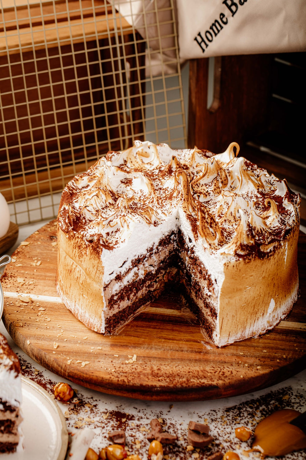 Chocolate chiffon sponge cake, hazelnut feuilletine crunch and chocolate pastry cream covered with mix of chocolate and vanilla meringue