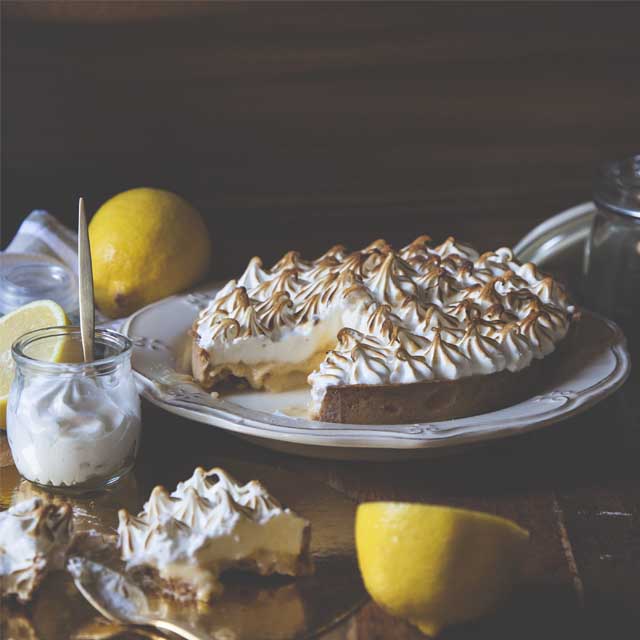 Shortbread biscuit crust with a tangy lemon curd filling, topped with fluffy meringue