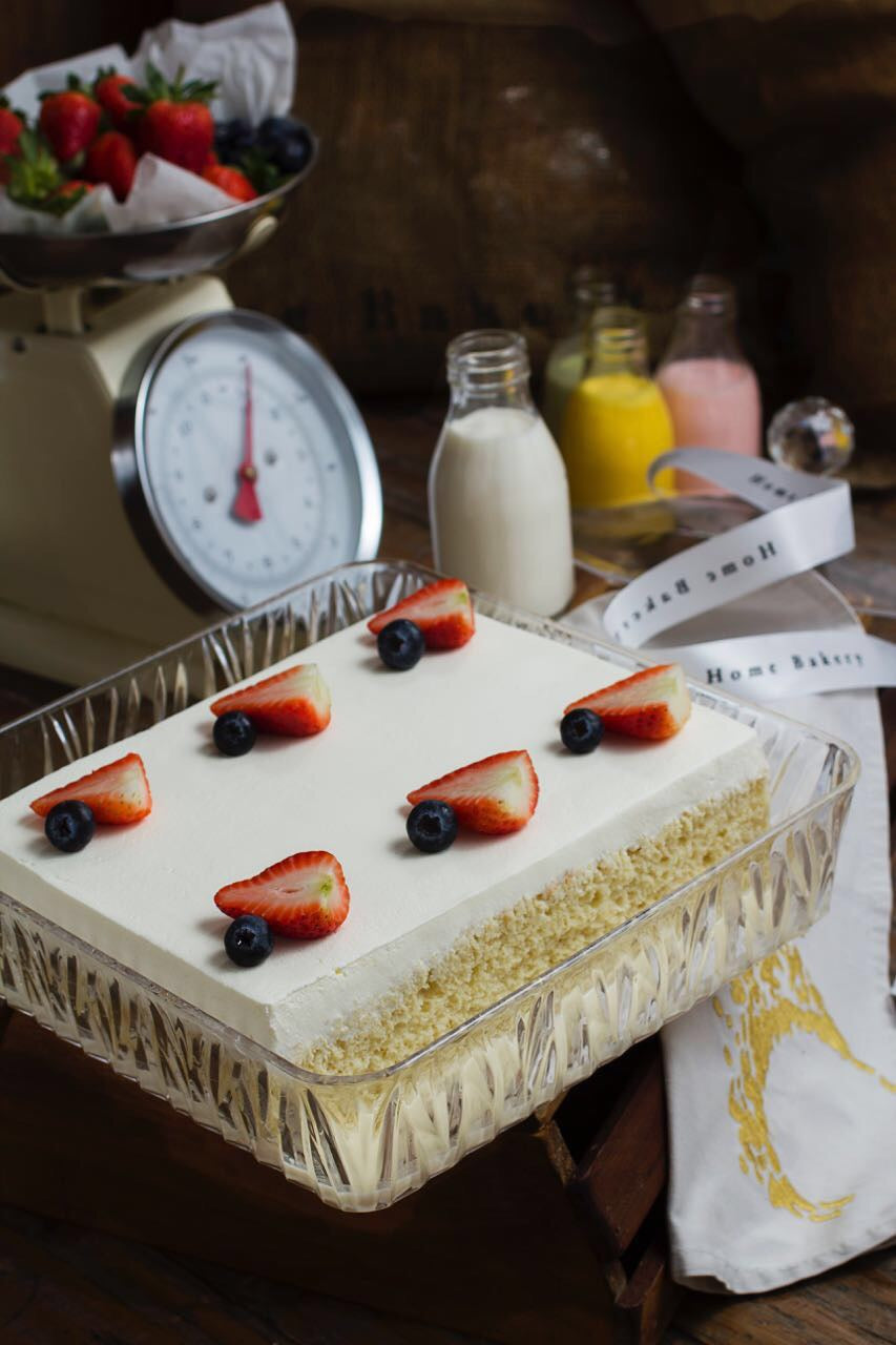 Moist vanilla sponge soaked in our very own milk sauce, topped with light cream and berries