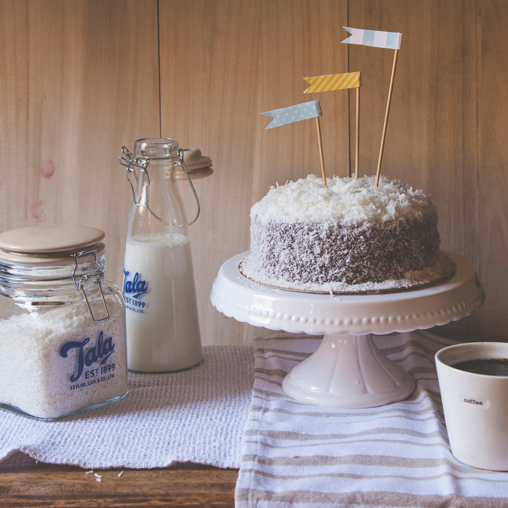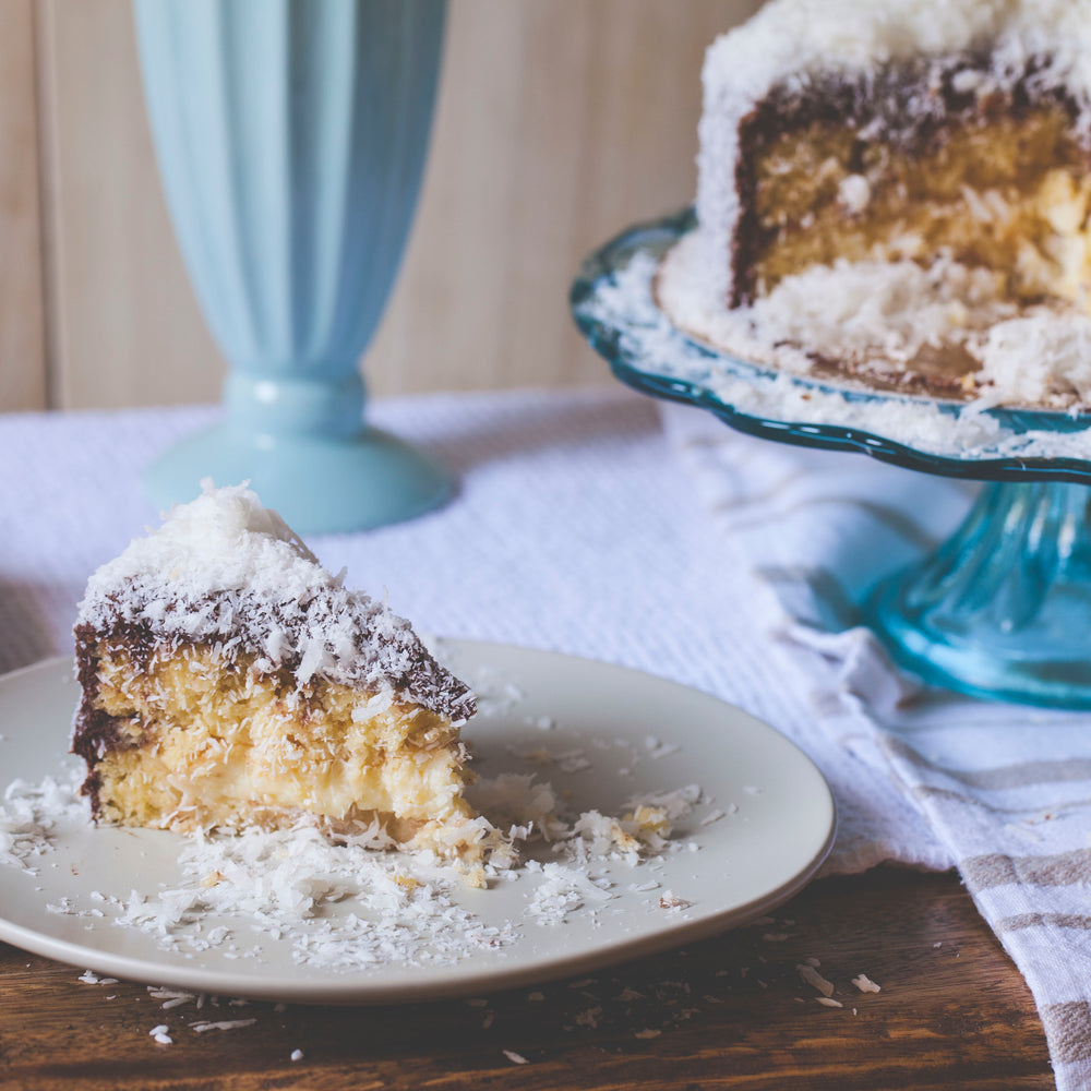 Coconut sponge cake sandwiched between coconut cream filling and covered with a milk chocolate frosting and decorated with sweetened coconut