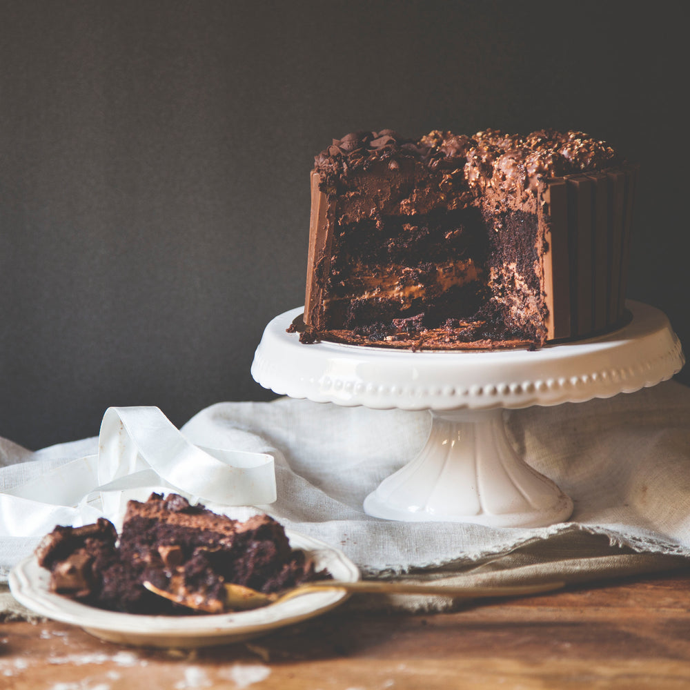 Nutella sponge sandwiched between Nutella ganache and decorated with Kitkat on the sides and topped with Ferrero Roche and Nutella ganache
