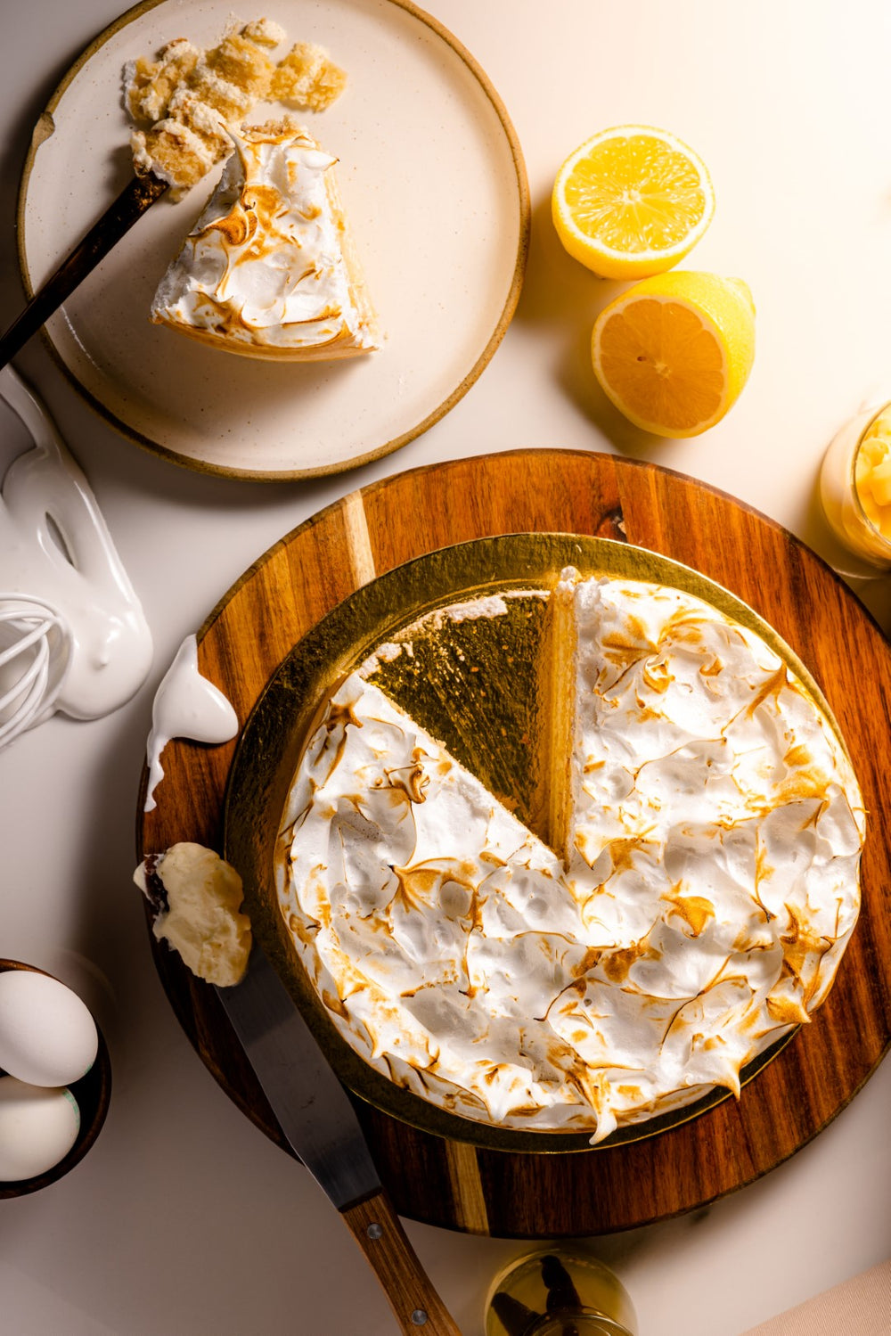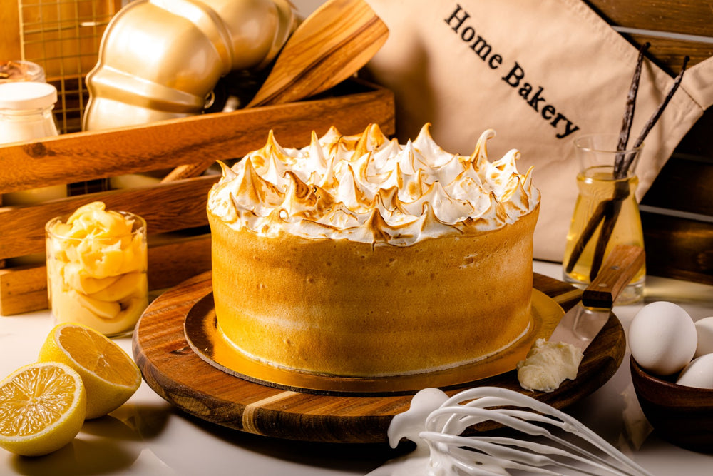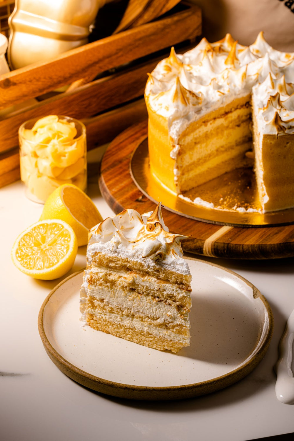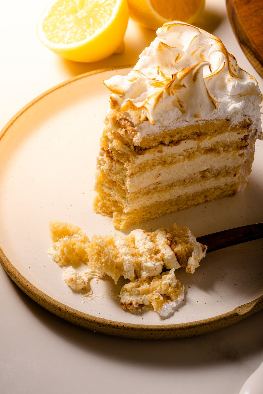 Layers of chiffon sponge, vanilla cream, covered with meringue and torched