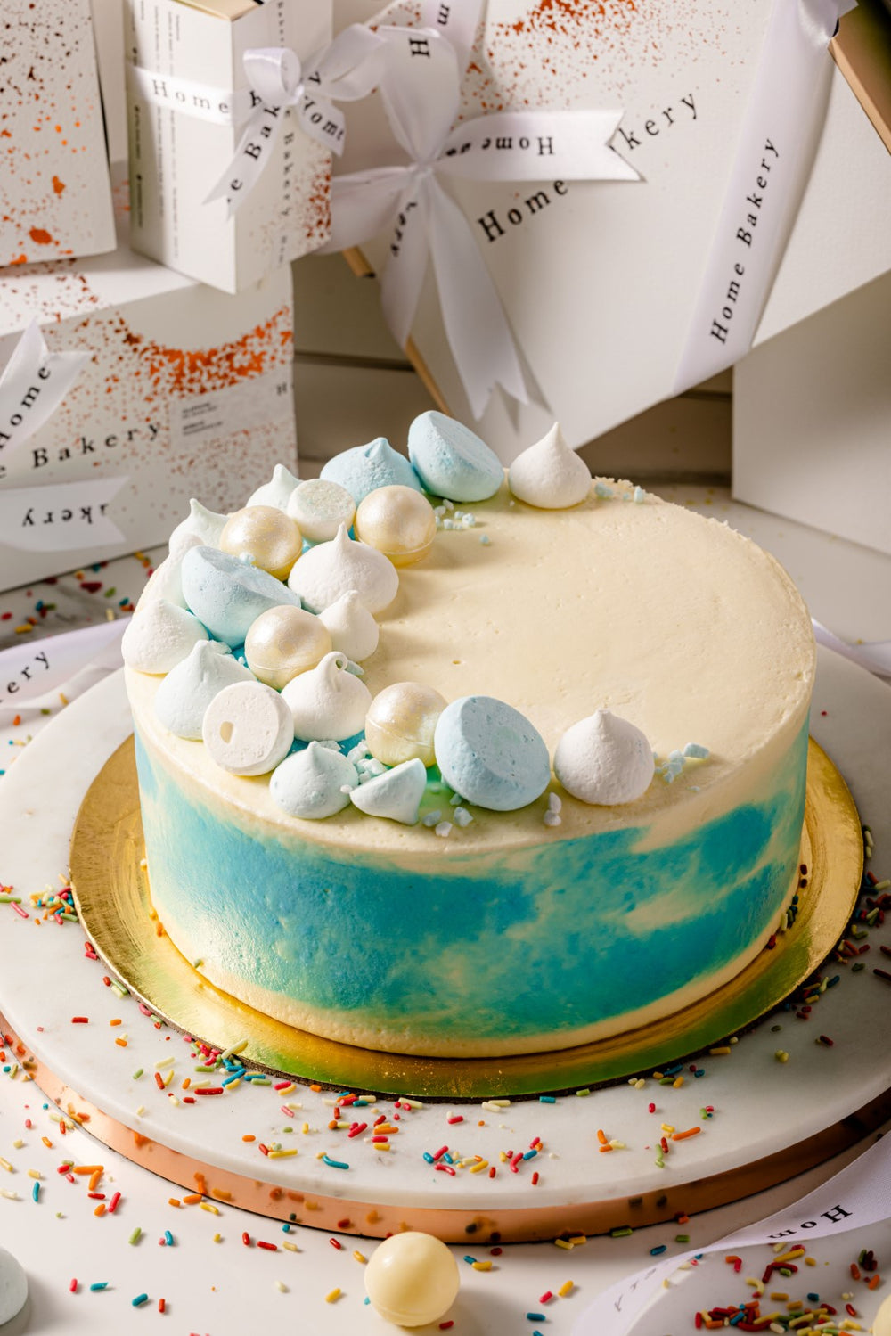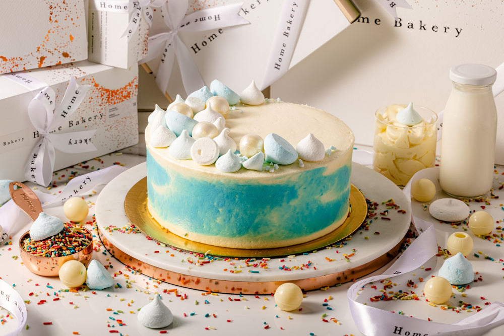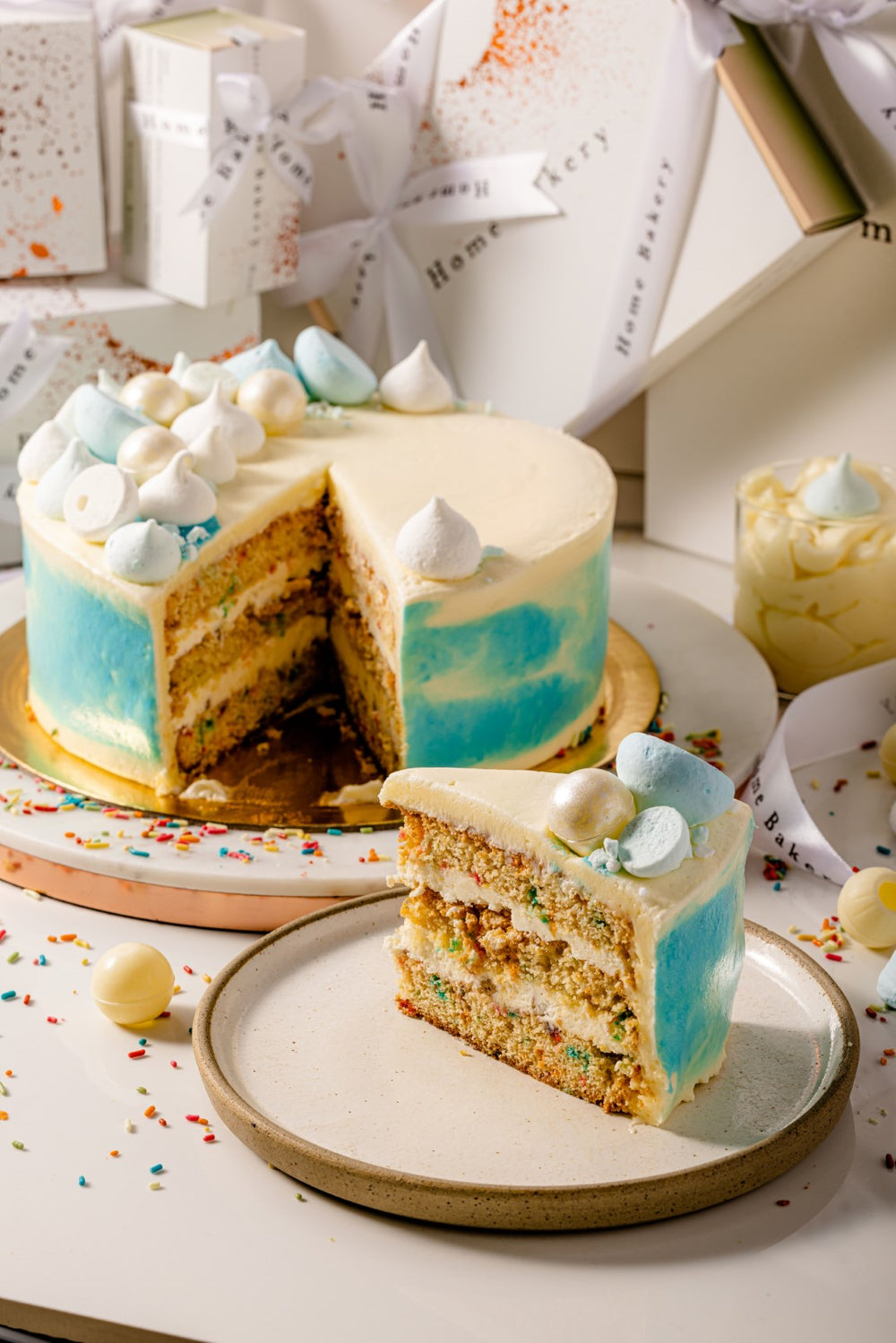 Vanilla sponge cake with vanilla confetti crumble, covered in vanilla milk cream garnished with meringue